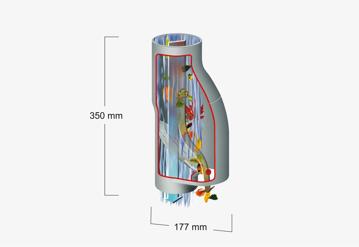 - Scheidet Laub und Grobschmutz zuverlässig ab – ein Verstopfen des Fallrohres wird vermieden