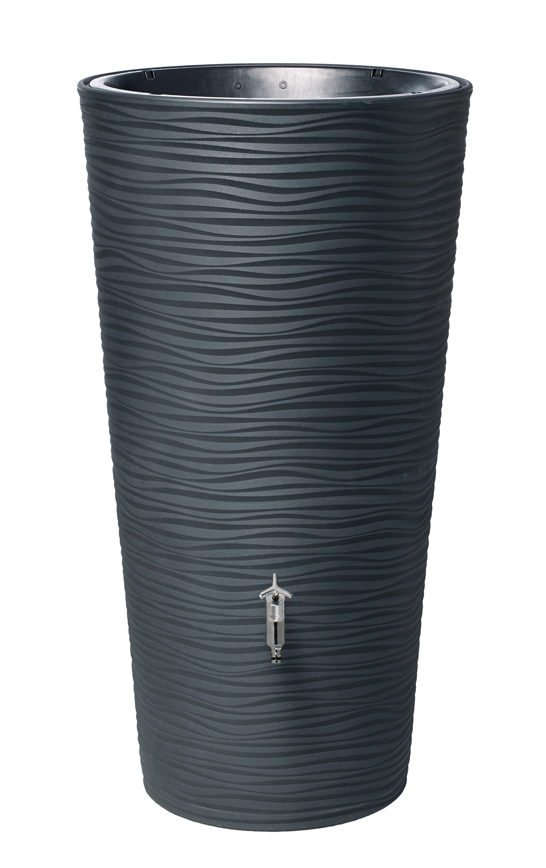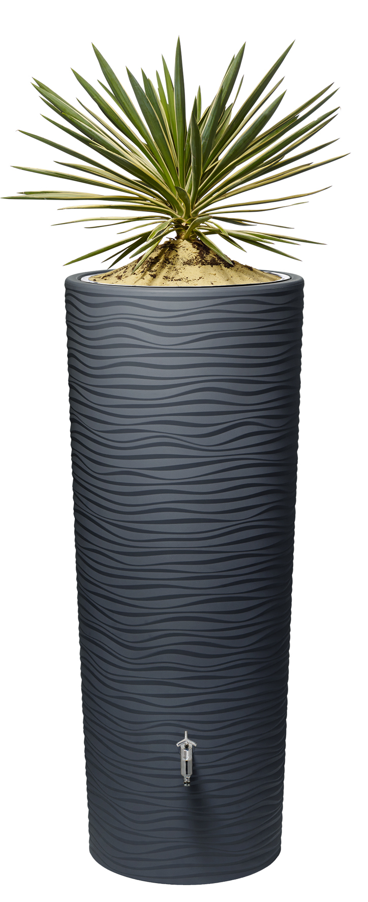 Natur pur! Der Behälter mit wellenförmiger Oberflächenstruktur präsentiert sich je nach Lichteinfall in immer neuen Facetten. So setzt der Natura 2in1 Regenspeicher lebendige Akzente auf Ihrer Terrasse.