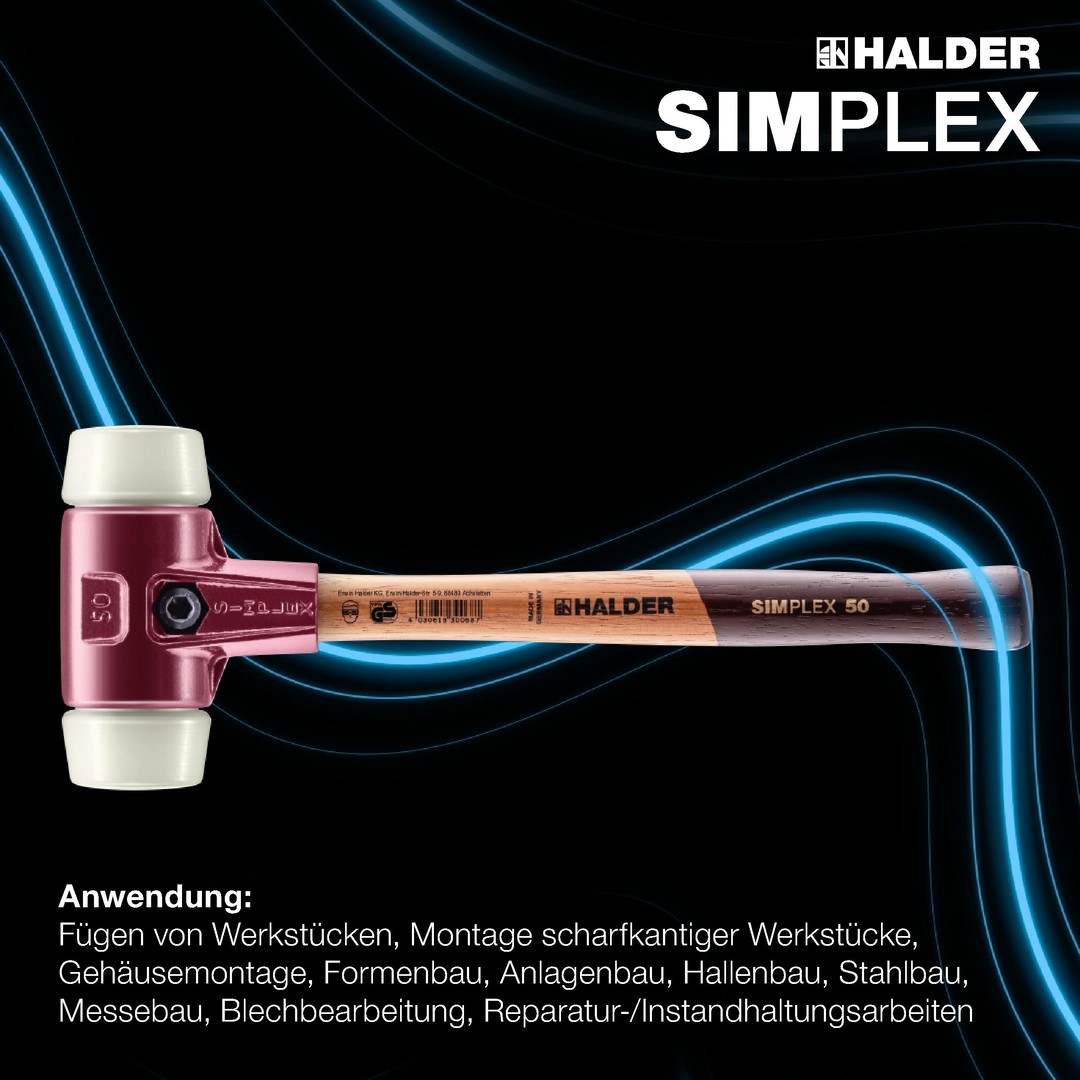 Bei diesem SIMPLEX–Schonhammer sind spezielle Schlageinsätze D50mm in das Gehäuse D40mm verbaut. Die überdimensionalen Schlagflächen ermöglichen einen maximalen Schutz für gefühlvolles Bearbeiten von Werkstücken mit empfindlichen Oberflächen.