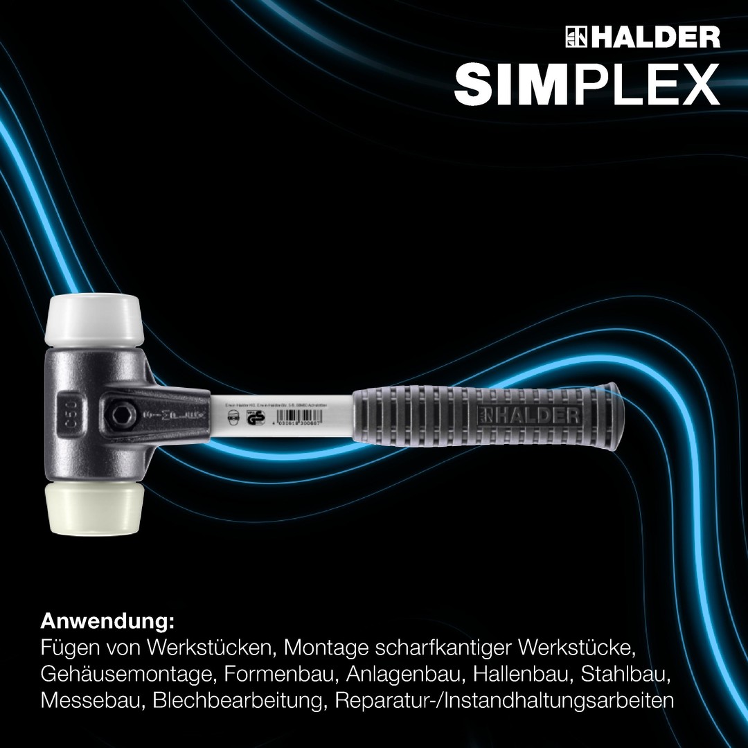- SIMPLEX–Schonhammer in der Einsatzkombination Superplastik (weiß, mittelhart, sehr widerstandsfähig) / Nylon (weiß, hart, sehr verschleißfest, kein Absplittern auch bei Minustemperaturen, öl- und fettbeständig).