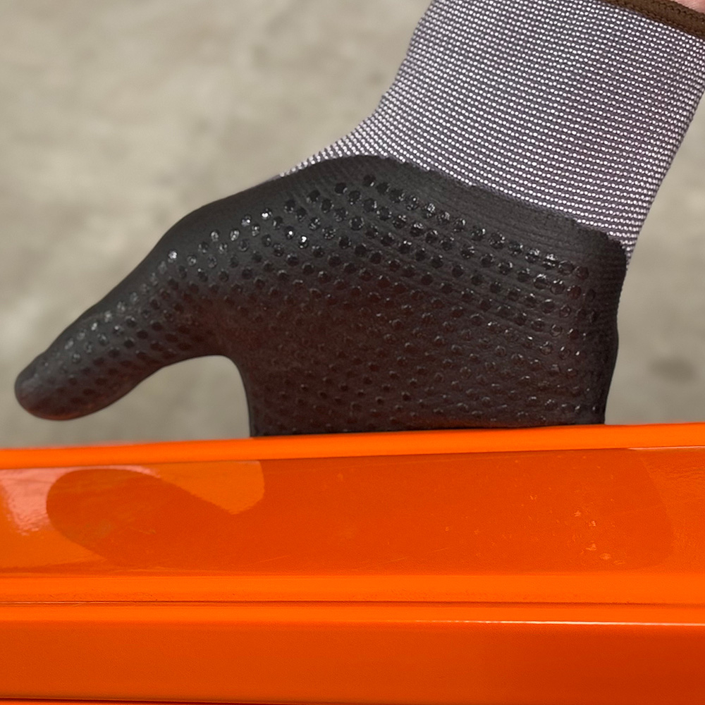 Montagehandschuh aus 15 Gauge Nylonfeinstrick mit hohem Tragekomfort, Nitrilschaum Beschichtung und Nitrilbenoppung an Handinnenfläche und Fingerkuppen