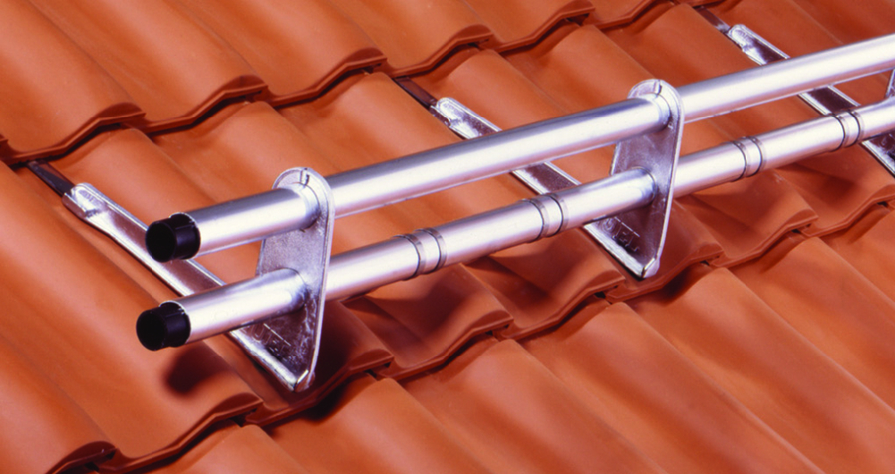 Halterung für DoublePipe auf Ton- und Betonpfannendächer. Der Abstand zwischen den Halterungen darf maximal 90 cm betragen. Bei Schneelastzone 3 muss der Abstand auf 60 cm verkürzt werden.