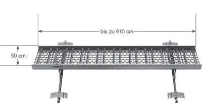 Mit einer Breite von 50 cm und einer Länge bis zu 610 cm, verfügt er über eine integrierte Fußleiste und einen Laufschuh zum Einhaken von Sicherheitsgeschirren.