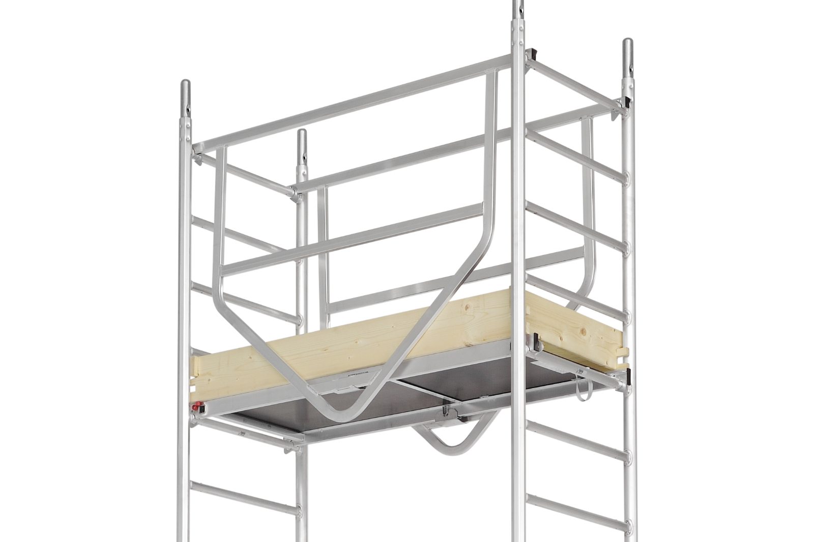 - Von unten einhängbares Geländer als Seitenschutz beim Auf- und Abbau