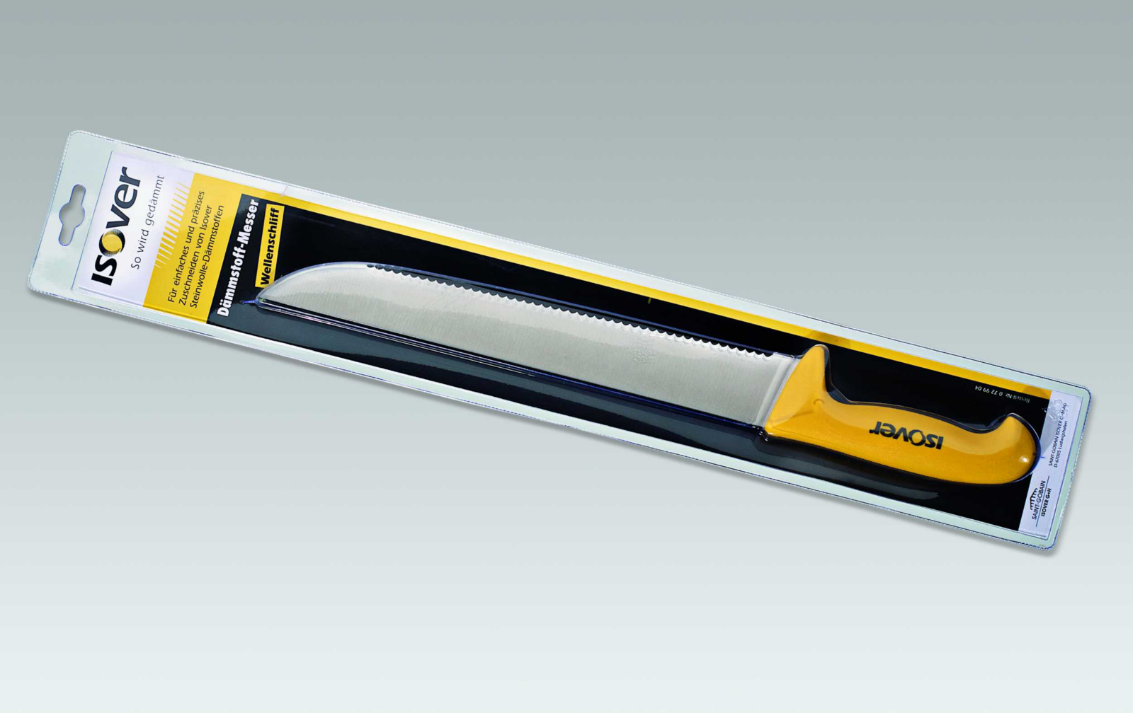 Das ISOVER Dämmstoffmesser mit Wellenschliff eignet sich zum präzisen Zuschneiden von festeren Mineralwolle-Dämmstoffen, wie z. B. Steinwolle. Das Messer besitzt eine extra lange (30 cm) Klinge und eignet sich gut für große Dämmstoffstärken. Das Wellenschliffmesser hat einen glatt geschliffenen Spitzenbereich (besser nachschärfbar). Ergonomischer, rutschfester Griff; biegsteife, rostfreie Klinge aus Edelstahl.