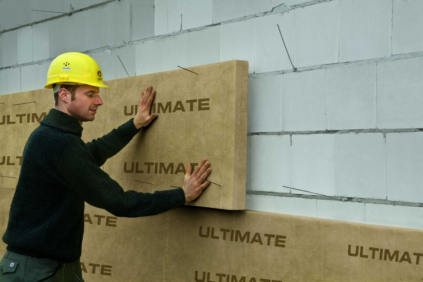 Wasserabweisender Mineralwolle-Dämmstoff, einseitig mit Glasvlies kaschiert. Zur Wärme- und Schalldämmung im zweischaligen Mauerwerk mit vollständig oder teilweise ausgefülltem Schalenzwischenraum gemäß DIN EN 1996 und DIN 4108-10. Die ULTIMATE KD-034 bietet eine sehr hohe Stabilität und Elastizität im Plattenformat. Dies bedeutet weniger Verluste durch z.B. Kantenbruch. Die Flexibilität des Dämmstoffes verhindert eine Hinterströmung des Dämmstoffes an der Wand. Gleichzeitig wird schon bei einer einlagigen Verlegung der ULTIMATE KD-034 eine homogene Verfilzung im Fugenbereich und damit eine Verlegung ohne Wärme- und Schallbrücken leichter möglich.