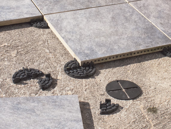 Mit Plattenfix können Steinplatten auch trocken – ohne Splittbett – verlegt werden und jederzeit wieder hochgenommen werden.