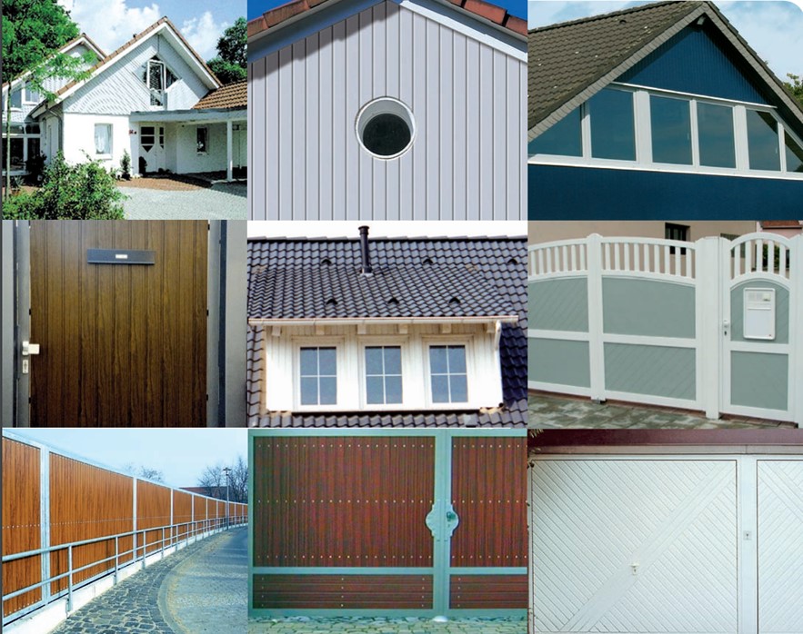 KömaPan eignet sich im Bausektor hervorragend für den Einsatz in Hoftorfüllungen, Garagentorfüllungen, Haustürfüllungen, Balkonfüllungen sowie für Fassadenverkleidungen, Attikaverkleidungen und Giebelverkleidungen.