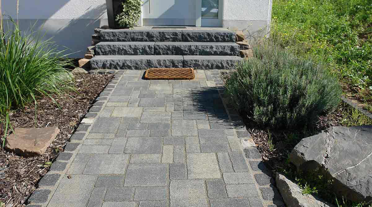- Das Pflaster-Modul 1 besteht aus fünf verschiedenen, großzügigen Steinformaten. Hiermit lassen sich flexibel sowohl ein natürlicher „wilder Verband“, aber auch ein klassisch ruhiger „Reihenverband“ verlegen.