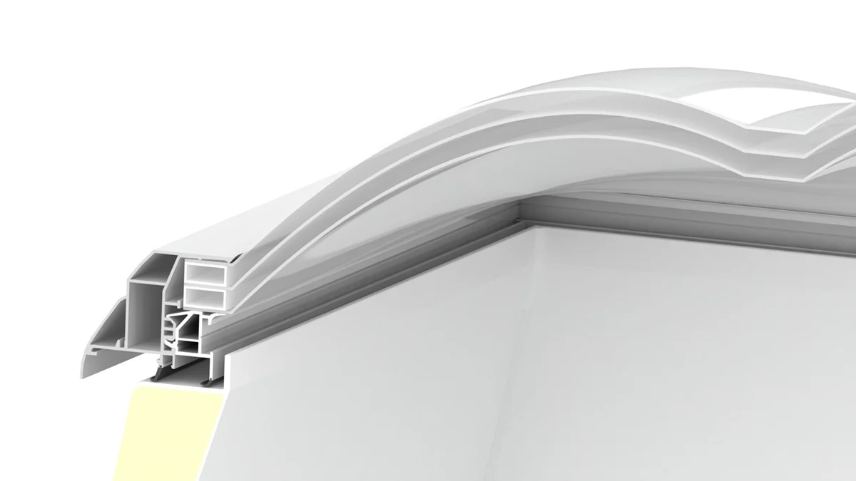 Durch clevere Geometrie anstatt mehr Material rüstet sich die Lichtkuppel für künftige Herausforderungen. Die neuartige Wellenform der Kuppelschale mit ihrem geschützten Design sorgt für eine bessere Lastabtragung und garantiert mehr Steifigkeit ohne mehr Materialeinsatz. Auf diese Weise bleibt die Lichtkuppel F100 W auch bei höheren Windgeschwindigkeiten wasserdicht und hält Wind und Schnee in höherem Maße stand.