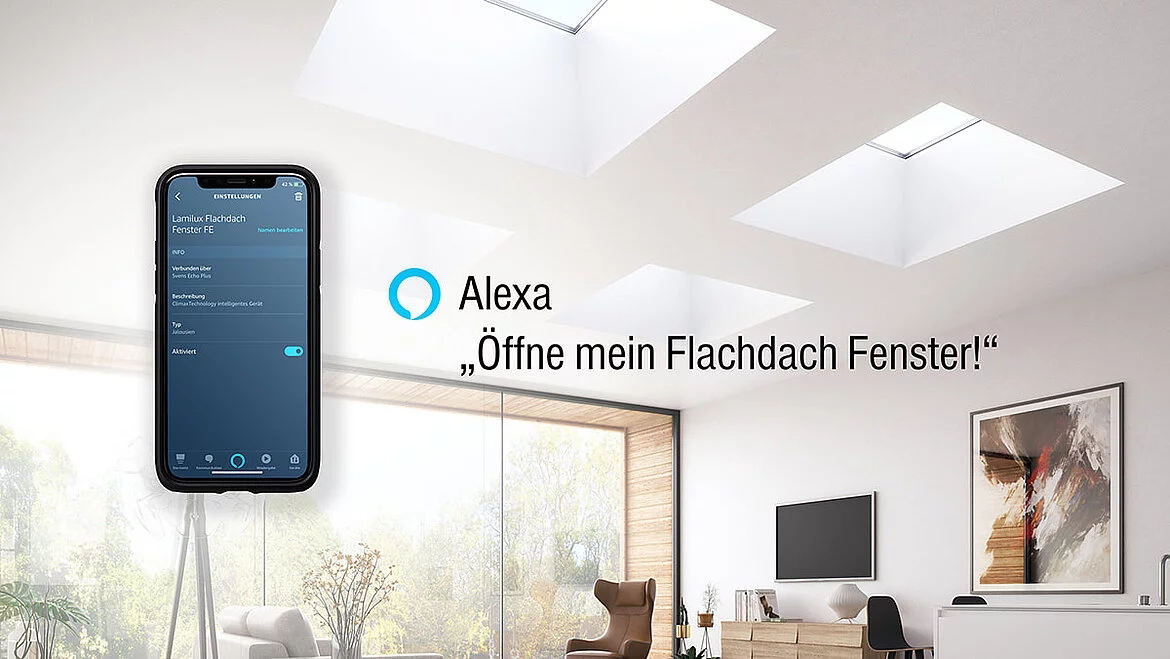Öffnen und Schließen Sie Ihr LAMILUX Flachdach Fenster oder steuern Sie Ihren Sonnenschutz über den Smart Speaker “Alexa” oder per App.
