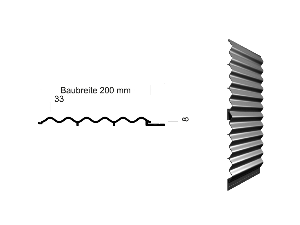 Aufgrund der hohen Wanddicke ist das Wellenpaneel 8/33 ein sehr widerstandsfähiges Paneel. Baubreite, Höhe und alle anderen Abmessungen sind fest. Die Befestigung erfolgt verdeckt.