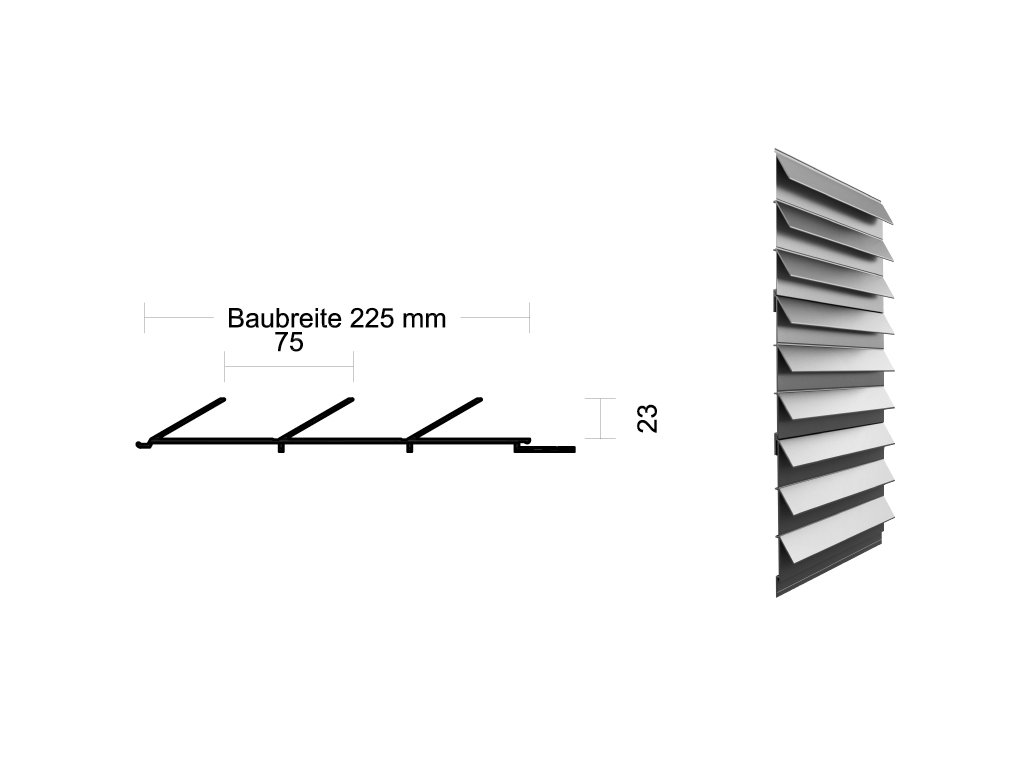 Gerne wird das Lamellenpaneel 23/75 im Bereich von Lüftungsgittern eingesetzt. Hierbei werden die in das Paneel gefrästen Lüftungslöcher von den vorhängenden Lamellen optisch verdeckt. Aufgrund der hohen Wanddicke ist das Lamellenpaneel 23/75 ein sehr widerstandsfähiges Paneel. Baubreite, Höhe und alle anderen Abmessungen sind fest. Die Befestigung erfolgt verdeckt.