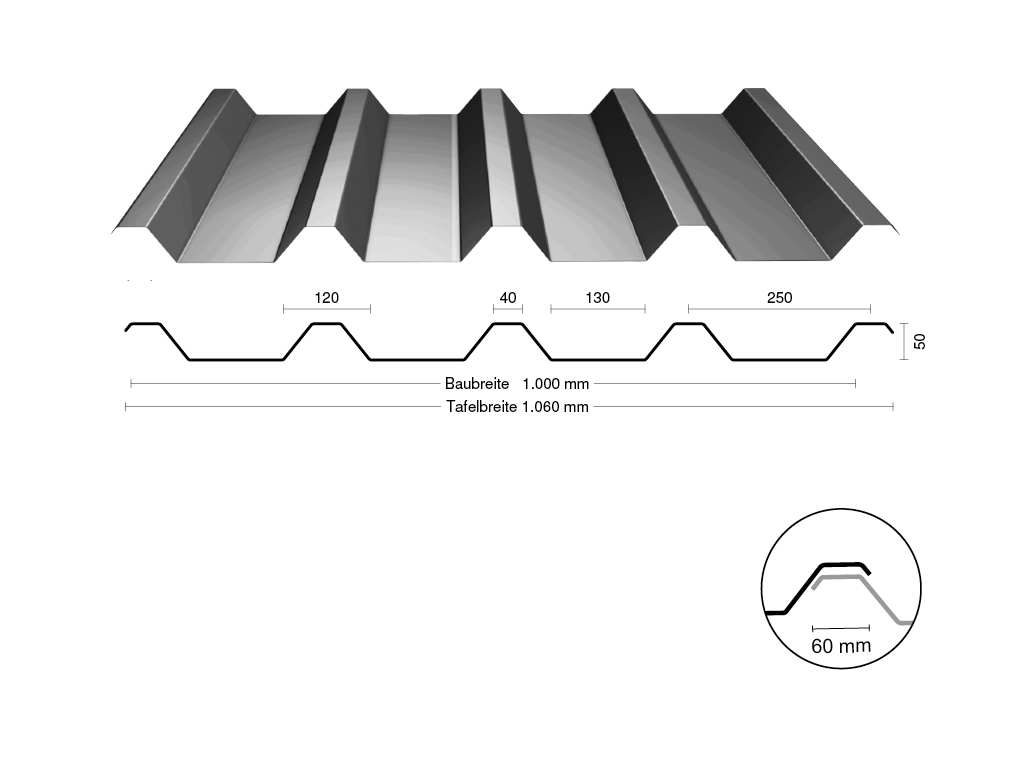Das Trapezprofil 50-250 ist stark profiliert, mit hohen Obergurten. Hierdurch ist es ein sehr tragfähiges Profil.