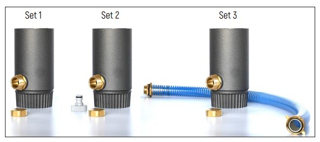 - Variante 3: mit Messing Verschlusskappe, ca. 80cm langen 1"-Schlauch mit hochwertigen Messinggarnituren und Dichtungen für den direkten Anschluss an Ihre Regentonne.