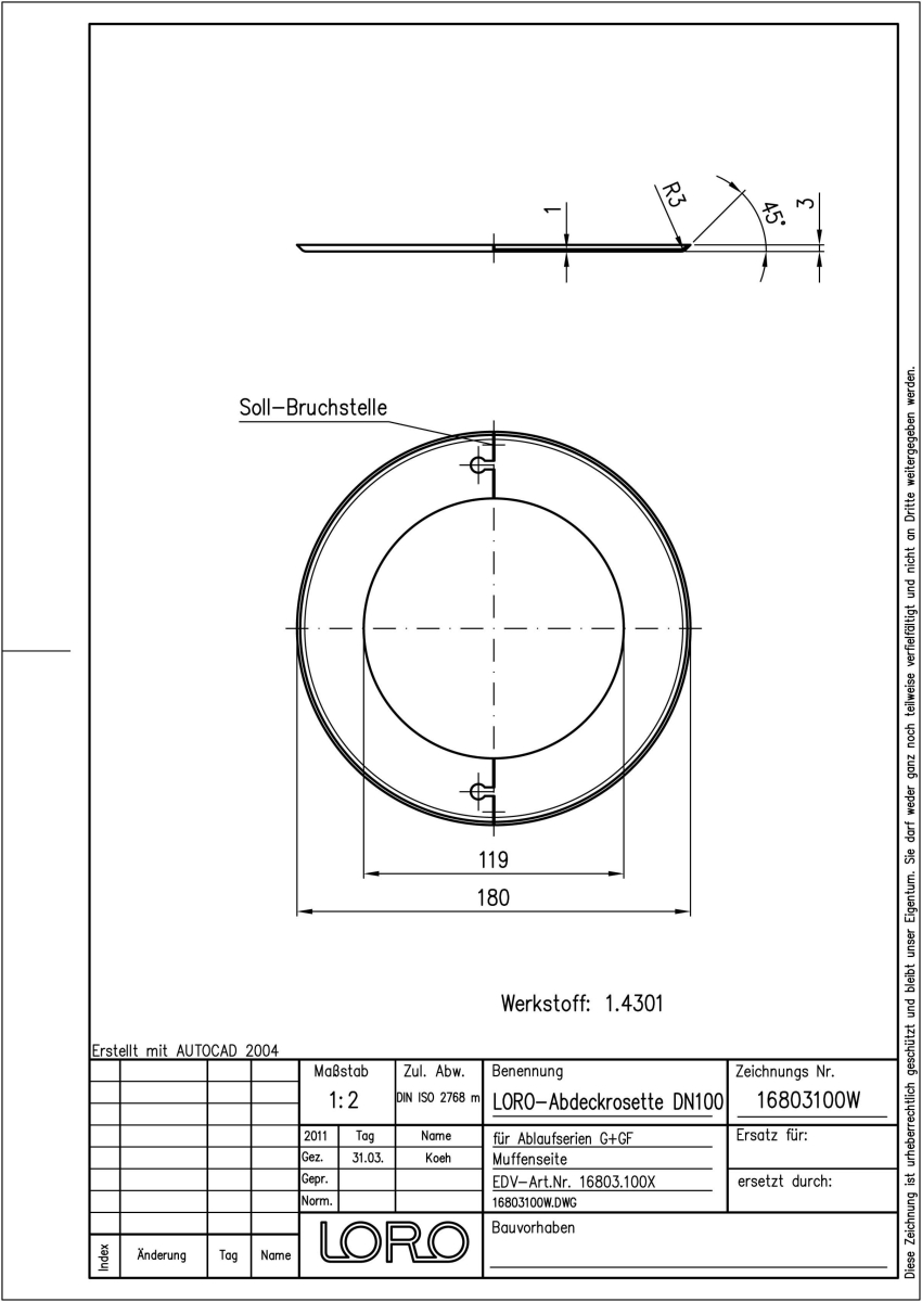 LORO-Balkonablauf-Abdeckrosette für Abdeckung des Deckendurchbruchs unterhalb der Balkondecke, aus Eddelstahl 1.4301, mit Durchgangsöffnung für Muffe, für Balkonablaufserien G, GF, I, IK, DN 100
