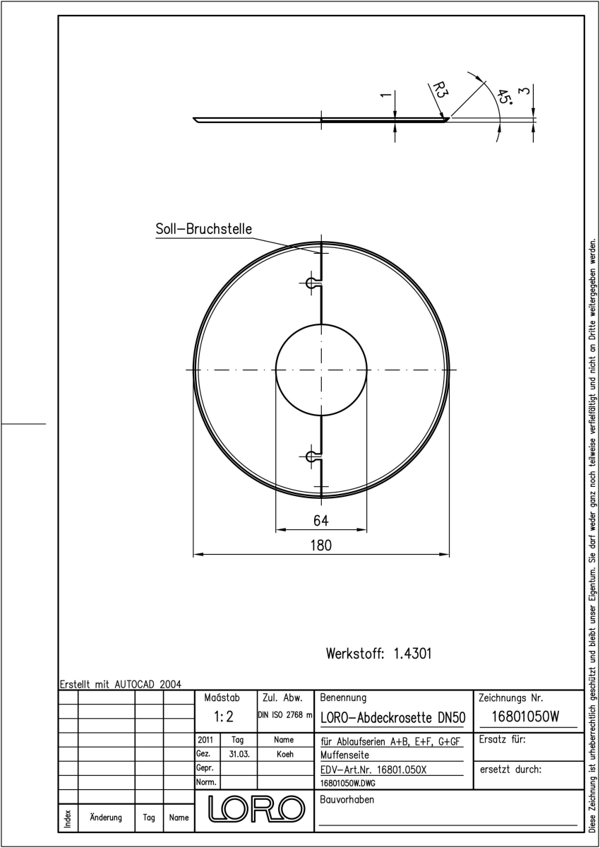 LORO-Balkonablauf-Abdeckrosette für Abdeckung des Deckendurchbruchs unterhalb der Balkondecke, aus Edelstahl 1.4301, mit Durchgangsöffnung für Muffe, für Balkonablaufserien A, B, BE, E, F, FF, G, GF, I, IK, DN 50