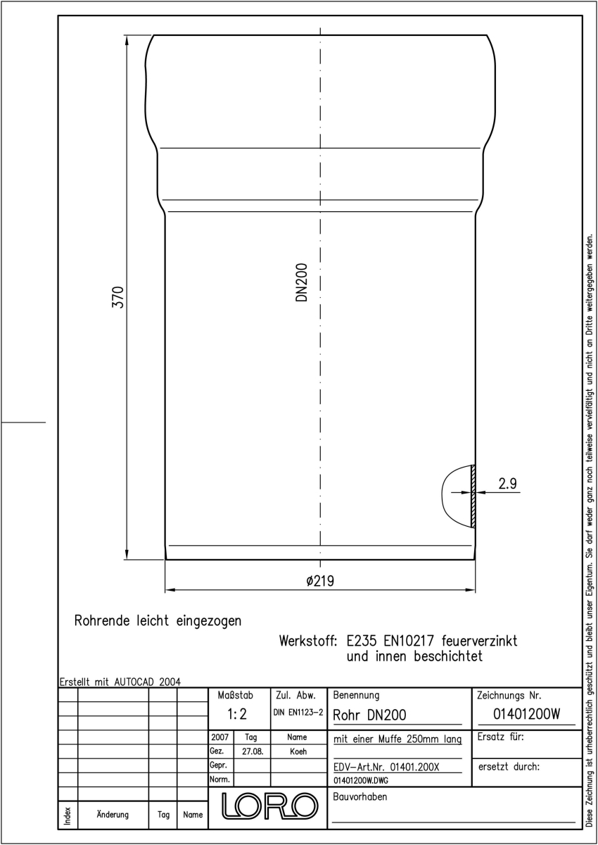 LORO-X Rohr, aus Stahl, feuerverzinkt, nach DIN EN 1123 mit erhöhtem Qualitätsstandard gemäß RAL-Gütezeichen GZ-694, mit 2-Kammern-Steckmuffenverbindung, Baustoffklasse A1, formstabil, bruchfest, rückstausicher, langlebige Innenbeschichtung gemäß DIN EN ISO 2178 auf Basis einer 2K-Epoxid-Kombination, Farbton: Rotbraun, 250 mm + 1 Muffe, DN 200