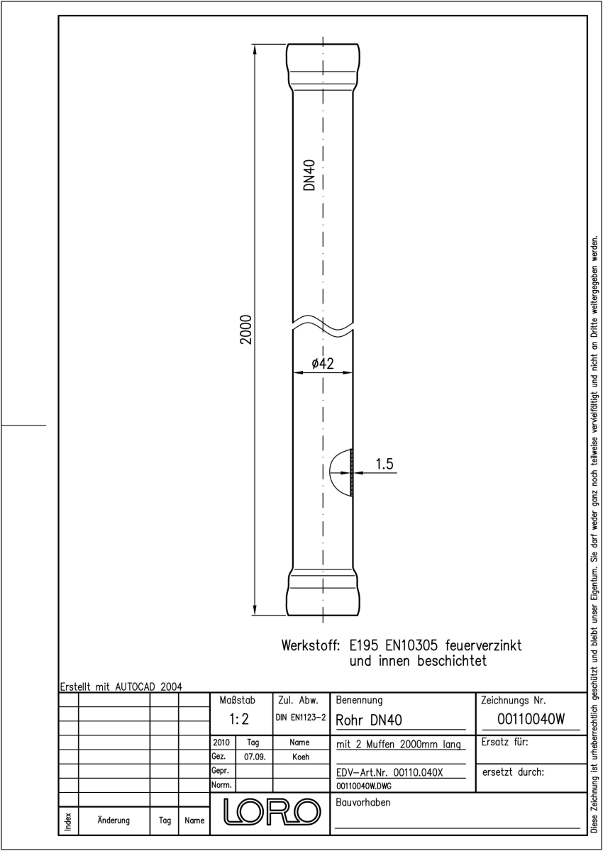 LORO-X Rohr, aus Stahl, feuerverzinkt, nach DIN EN 1123, mit erhöhtem Qualitätsstandard gemäß RAL-Gütezeichen GZ-694, mit 2-Kammern-Steckmuffenverbindung, Baustoffklasse A1, formstabil, bruchfest, rückstausicher, langlebige Innenbeschichtung gemäß DIN EN ISO 2178 auf Basis einer 2K-Epoxid-Kombination, Farbton: Rotbraun, 2000 mm mit 2 Muffen, DN 40