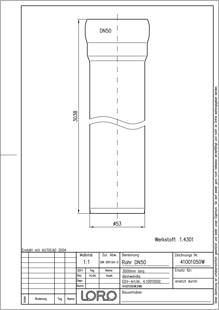 LORO-XCL Rohr, aus Edelstahl, Werkstoff Nr. 1.4301, gebeizt und passiviert, nach DIN EN 1124 mit erhöhtem Qualitätsstandard gemäß RAL-Gütezeichen GZ-694, mit 2-Kammern-Steckmuffenverbindung, Baustoffklasse A1, formstabil, bruchfest, rückstausicher, 3000 mm + 1 Muffe, DN 50