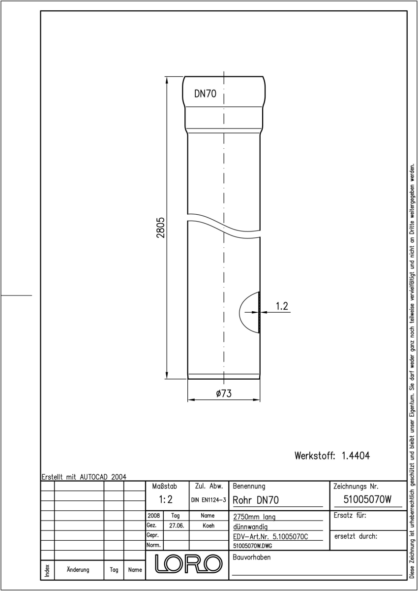 DN 70, 2750mm, Steckm., V4A