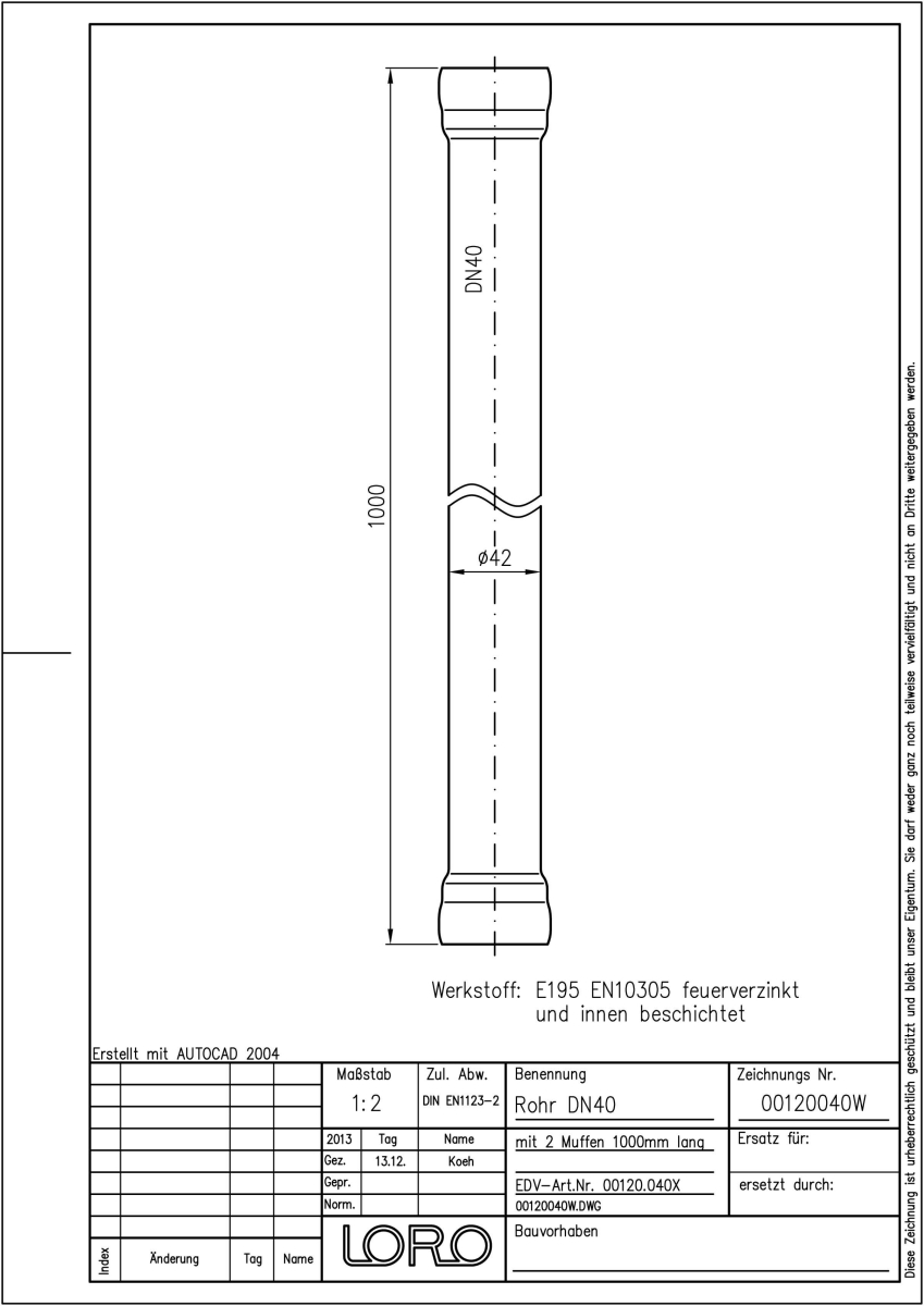 LORO-X Rohr, aus Stahl, feuerverzinkt, nach DIN EN 1123, mit erhöhtem Qualitätsstandard gemäß RAL-Gütezeichen GZ-694, mit 2-Kammern-Steckmuffenverbindung, Baustoffklasse A1, formstabil, bruchfest, rückstausicher, langlebige Innenbeschichtung gemäß DIN EN ISO 2178 auf Basis einer 2K-Epoxid-Kombination, Farbton: Rotbraun, 1000 mm mit 2 Muffen, DN 40
