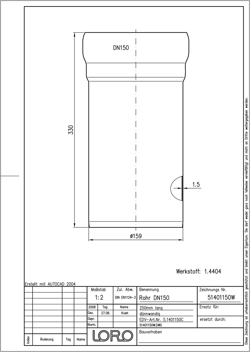 LORO-XCL Rohr, aus Edelstahl, Werkstoff Nr. 1.4404, gebeizt und passiviert, nach DIN EN 1124 mit erhöhtem Qualitätsstandard gemäß RAL-Gütezeichen GZ-694, mit 2-Kammern-Steckmuffenverbindung, Baustoffklasse A1, formstabil, bruchfest, rückstausicher, 250 mm, + 1 Muffe, DN 150