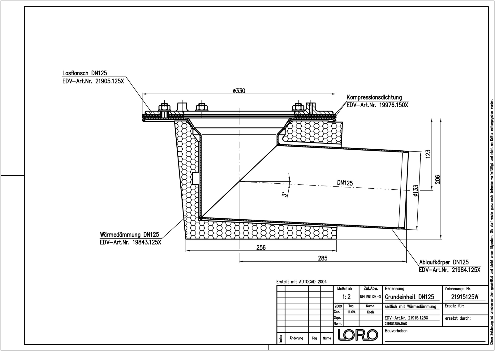 LORO-DRAINLET Flachdachablauf Grundeinheit, für Freispiegelströmung ,nach DIN EN 1253 mit erhöhtem Qualitätsstandard gemäß RAL-Gütezeichen, mit Klemmflansch, als Los- und Festflanschkonstruktion, aus Edelstahl, Auslauf seitlich, mit Wärmedämmung, einteilig, bestehend aus Ablauftopf, Losflansch, einschließlich Kompressionsdichtungen, DN 125
