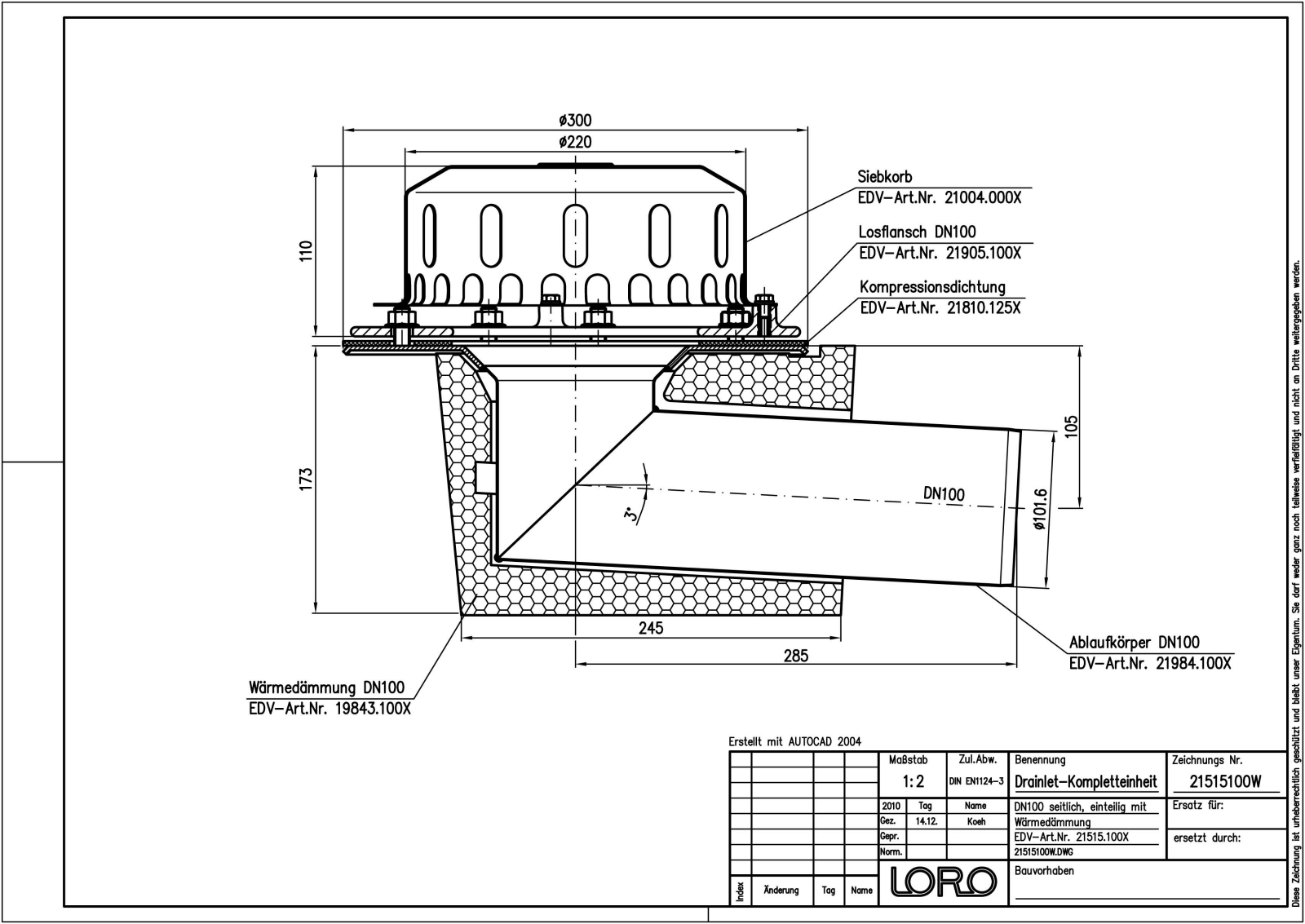 LORO-X DRAINLET Flachdachablauf, Serie 84(DL) einteilig mit Wärmedämmung, Auslauf seitlich 3 Grad, für Hauptentwässerung mit Freispiegelströmung, Abflussleistung 6,1 l/s bei 35 mm Wasserhöhe auf dem Dach, mit Klemmflansch als Los- und Festflanschkonstruktion inklusive Kompressionsdichtungen, für Bitumen- und Kunststoff- Abdichtungsbahnen, DRAINLET-Haube aus Edelstahl, nach DIN EN 1253 mit erhöhtem Qualitätsstandard gemäß RAL-Gütezeichen GZ-694, Leistungsnachweis mit normgerechtem Prüfsystem mit 4,2m nicht belüfteter Fallleitung gemäß LX-Datenblatt LX855, aus Edelstahl, DN 100