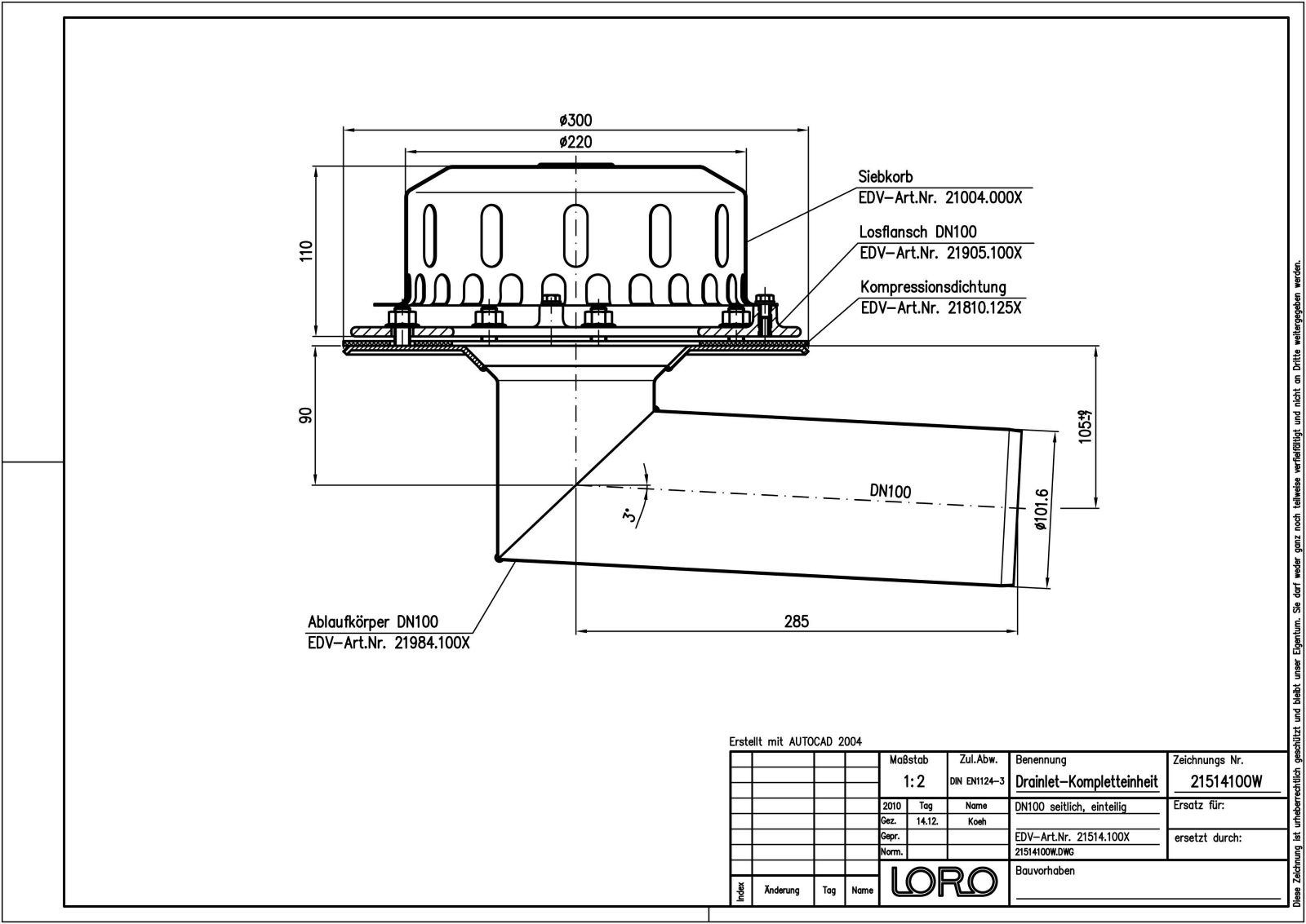 LORO-X DRAINLET Flachdachablauf, Serie 84(DL) einteilig ohne Wärmedämmung, Auslauf seitlich 3 Grad, für Hauptentwässerung mit Freispiegelströmung, Abflussleistung 6,1 l/s bei 35 mm Wasserhöhe auf dem Dach, mit Klemmflansch als Los- und Festflanschkonstruktion inklusive Kompressionsdichtungen, für Bitumen- und Kunststoff- Abdichtungsbahnen, DRAINLET-Haube aus Edelstahl, nach DIN EN 1253 mit erhöhtem Qualitätsstandard gemäß RAL-Gütezeichen GZ-694, Leistungsnachweis mit normgerechtem Prüfsystem mit 4,2m nicht belüfteter Fallleitung gemäß LX-Datenblatt LX855, aus Edelstahl, DN 100