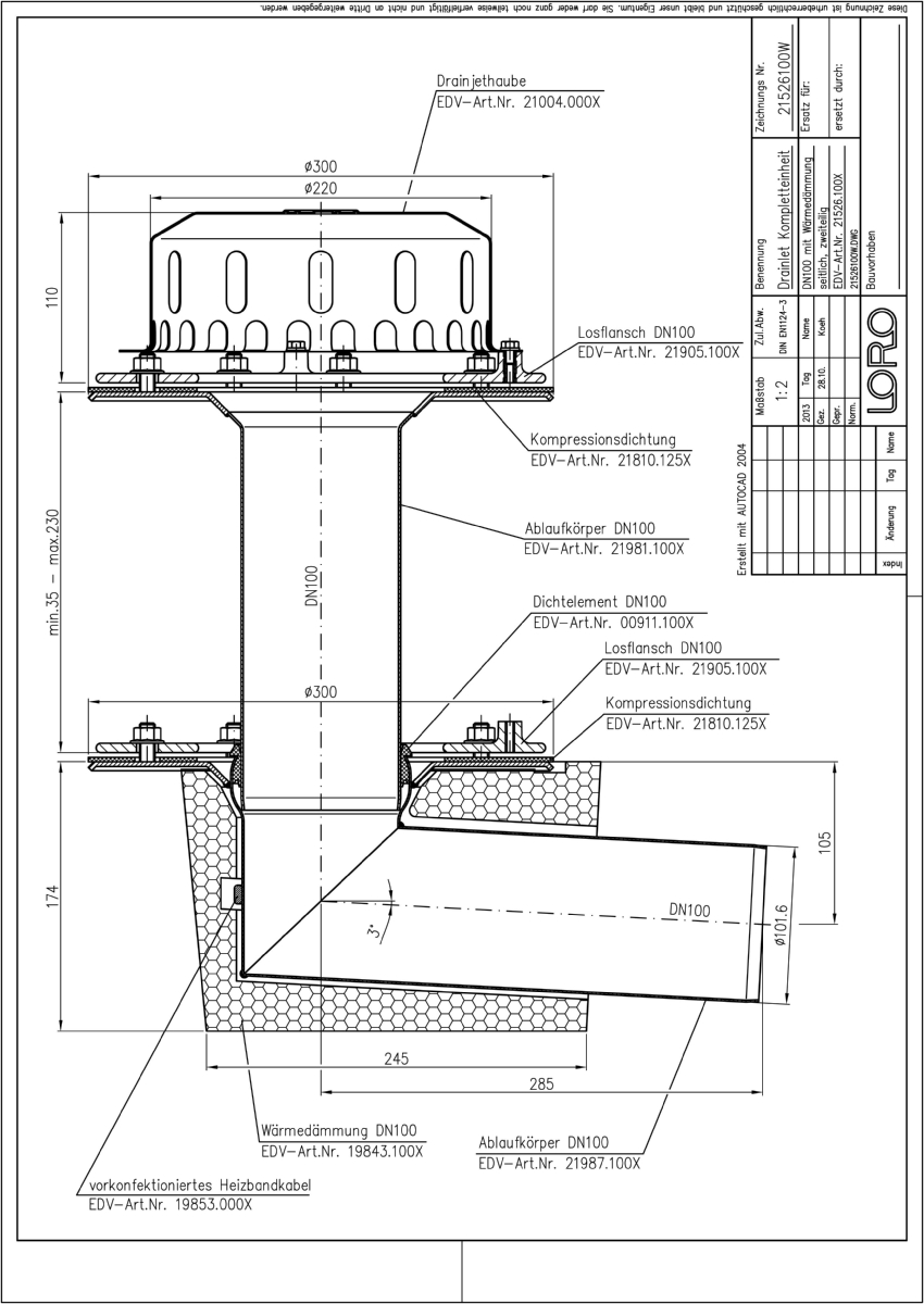 LORO-X DRAINLET Flachdachablauf, Serie 84(DL) zweiteilig mit Wärmedämmung und Heizung, Auslauf seitlich 3 Grad, für Hauptentwässerung mit Freispiegelströmung, Abflussleistung 6,1 l/s bei 35 mm Wasserhöhe auf dem Dach, mit Klemmflansch als Los- und Festflanschkonstruktion inklusive Kompressionsdichtungen, für Bitumen- und Kunststoff- Abdichtungsbahnen, DRAINLET-Haube aus Edelstahl, nach DIN EN 1253 mit erhöhtem Qualitätsstandard gemäß RAL-Gütezeichen GZ-694, Leistungsnachweis mit normgerechtem Prüfsystem mit 4,2m nicht belüfteter Fallleitung gemäß LX-Datenblatt LX855, aus Edelstahl, DN 100