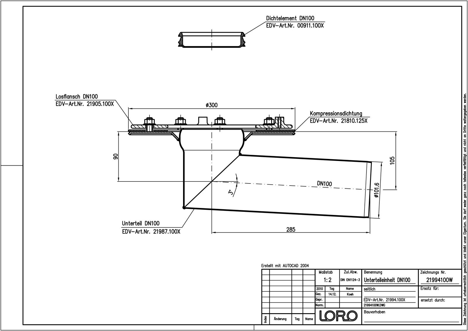 LORO-DRAINLET Flachdachablauf-Unterteileinheit für Freispiegelströmung, nach DIN EN 1253 mit erhöhtem Qualitätsstandard gemäß RAL-Gütezeichen, mit Klemmflansch, als Los- und Festflanschkonstruktion, aus Edelstahl, Auslauf seitlich, ohne Wärmedämmung, einteilig, bestehend aus Unterteil, Losflansch, einschließlich Kompressionsdichtungen, Dichtelement DN 100