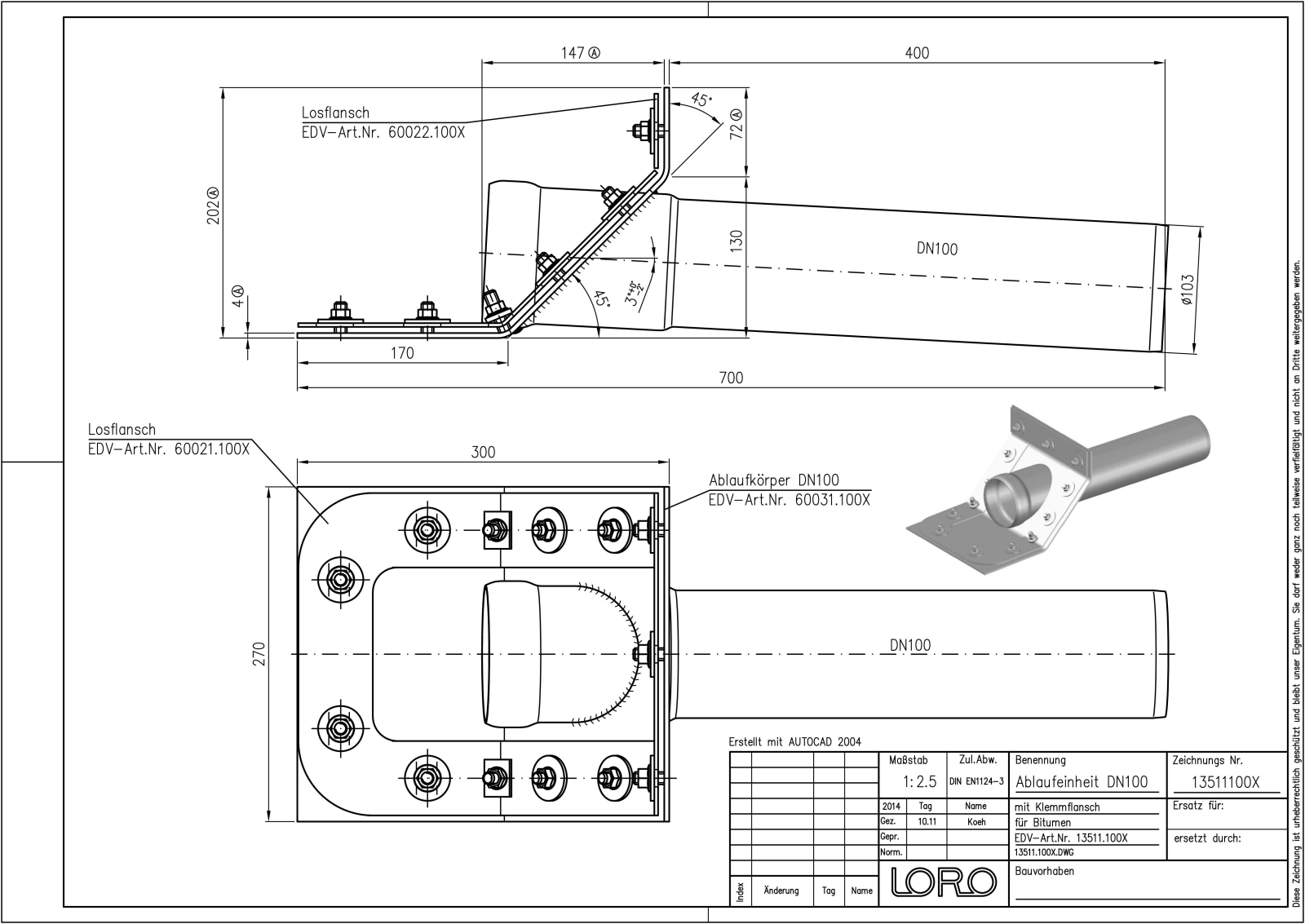mit Klemmflansch ohne Eingriff ins Dach als Los- und Festflanschkonstruktion für Bitumen-Abdichtungsbahnen aus Edelstahl DN 100