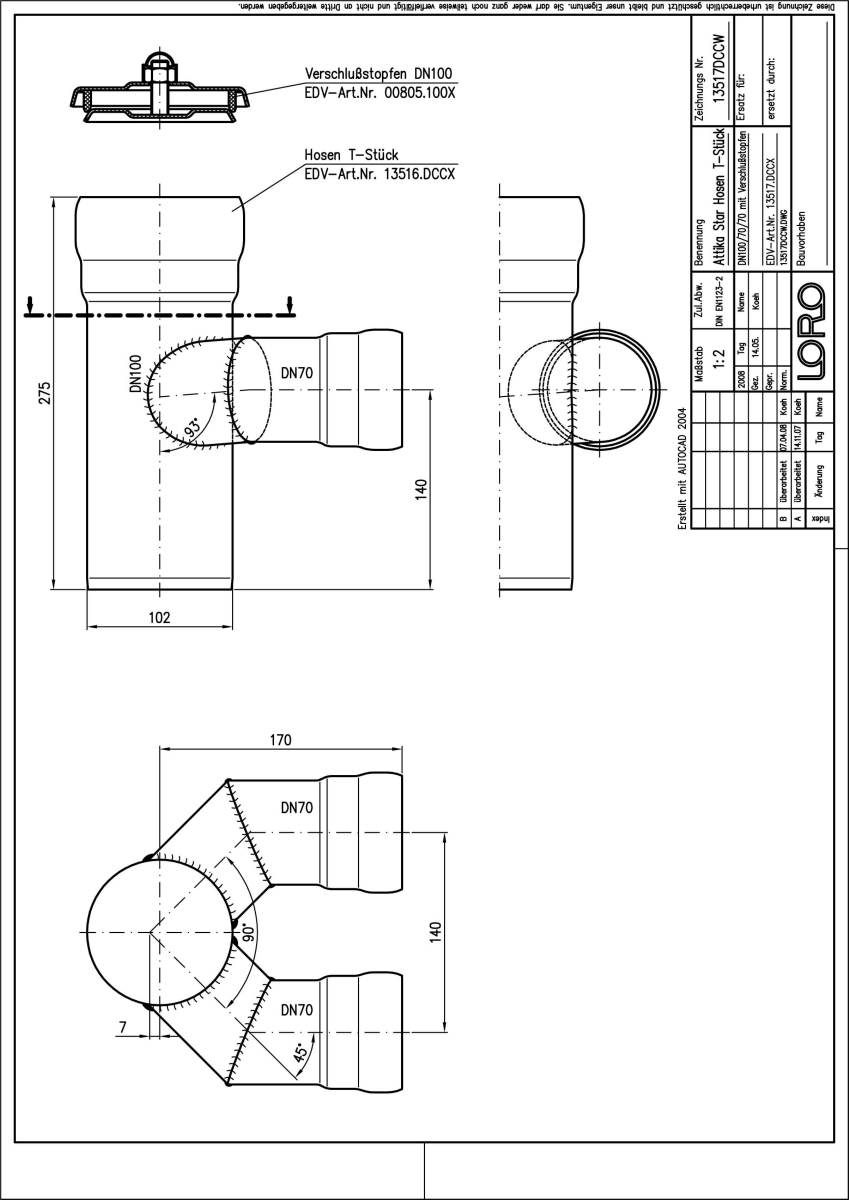 DN 100/70/70, m.Verschlussstopfen, fvz