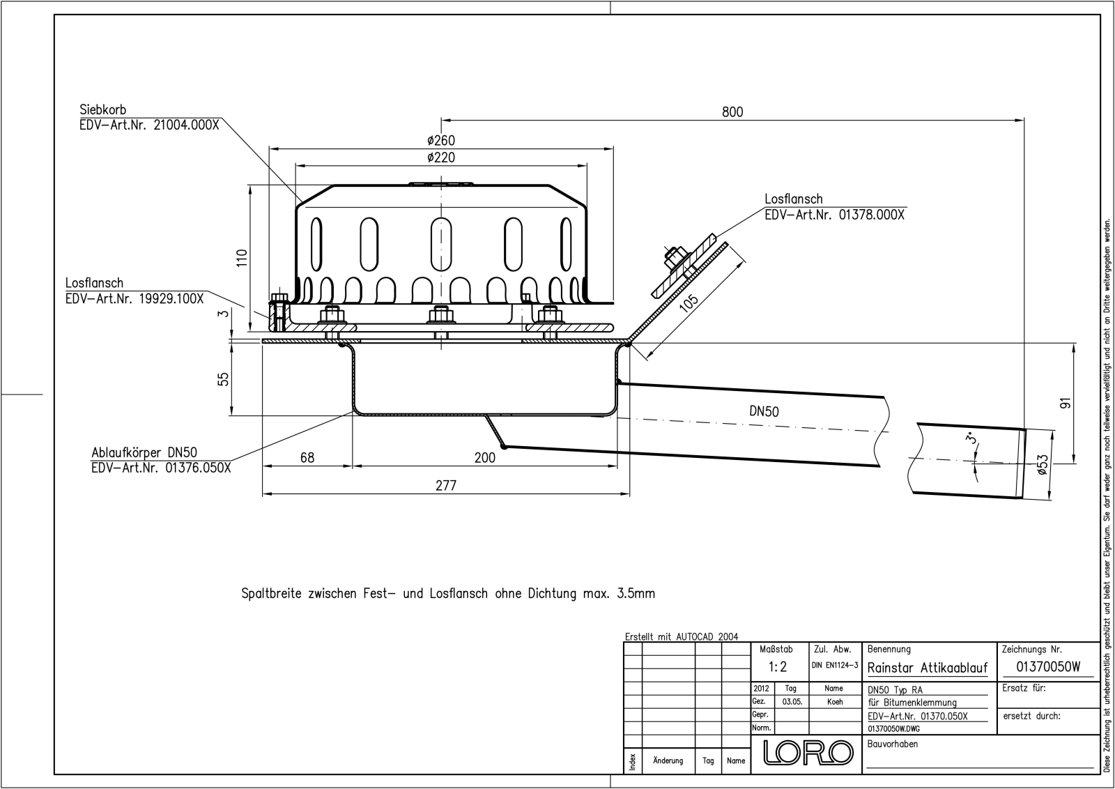 LORO-X RAINSTAR Attikaablauf, Serie 79 (RA) mit tiefgelegtem Rohr, für Hauptentwässerung mit Freispiegelströmung, Abflussleistung 5,1 l/s bei 35 mm Wasserhöhe auf dem Dach, mit Klemmflansch, als Los- und Festflanschkonstruktion, 45 Grad Aufkantung für Bitumen-Abdichtungsbahnen, Eingrifftiefe 82 mm, mit DRAINLET-Haube aus Edelstahl, nach DIN EN 1253, Leistungsnachweis mit normgerechtem Prüfsystem mit 4,2m nicht belüfteter Fallleitung gemäß Systemdatenblatt LX490, aus Edelstahl, DN 50