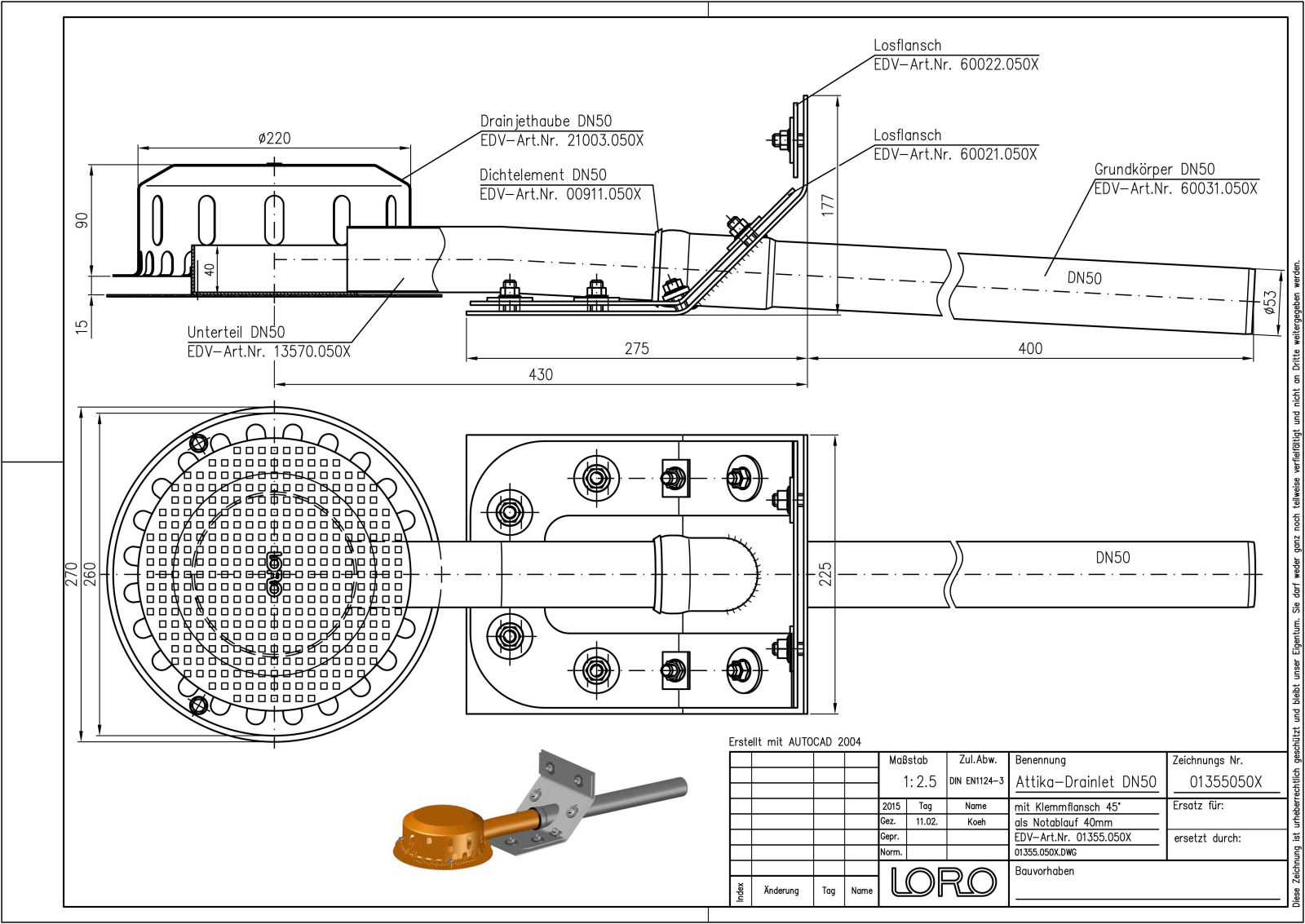 LORO-X DRAINLET Attikaablauf, Serie 62 ohne Eingriff ins Dach, für Notentwässerung mit Freispiegelströmung, Abflussleistung 1,0 l/s bei 75 mm Wasserhöhe auf dem Dach und 40 mm Wehrhöhe, mit Klemmflansch, als Los- und Festflanschkonstruktion, 45 Grad Aufkantung für Bitumen-Abdichtungsbahnen, Eingrifftiefe 0 mm, nach DIN EN 1253, Leistungsnachweis als Speier ohne Fallleitung gemäß Systemdatenblatt LX1584, aus Edelstahl, DN 50