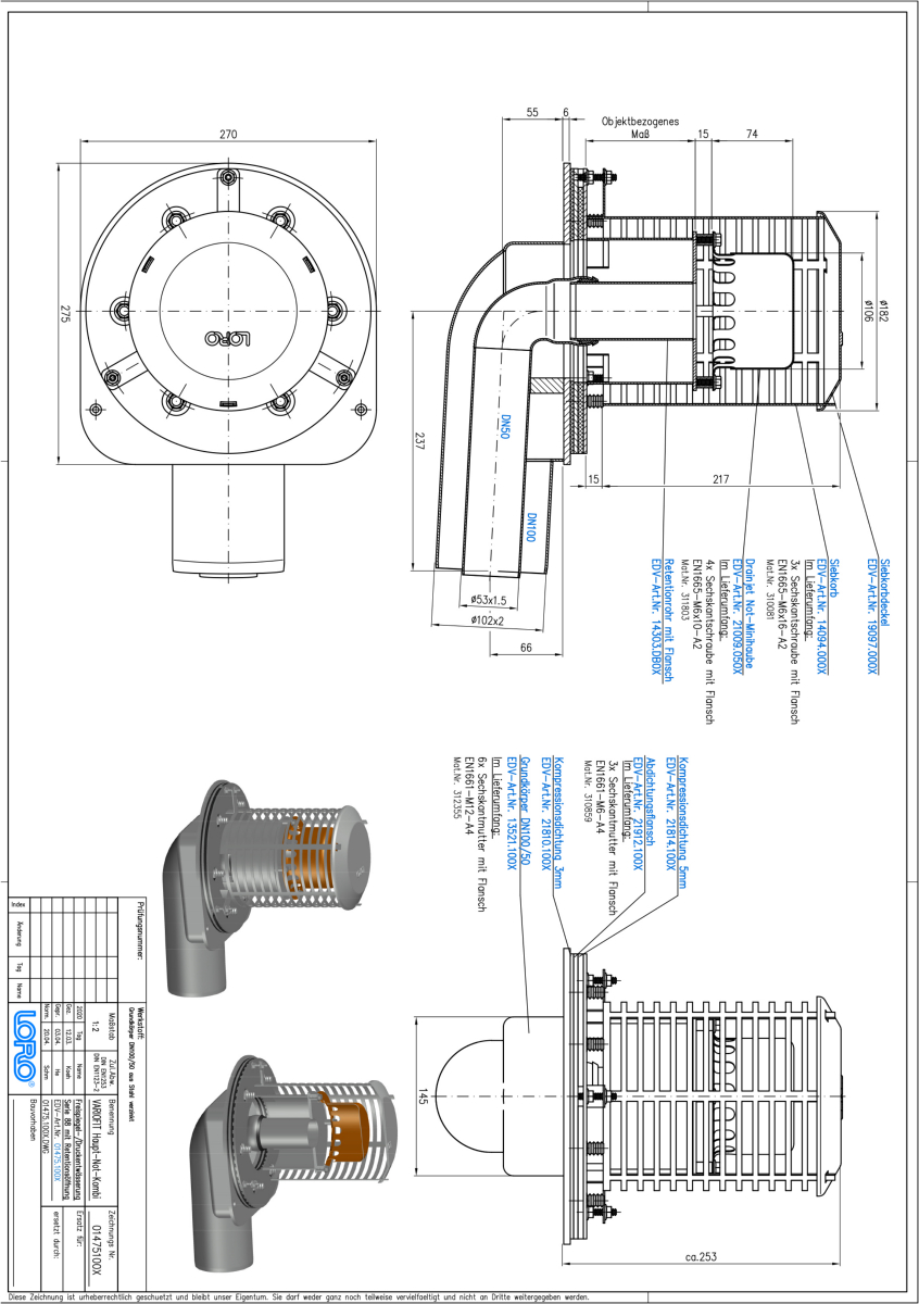 LORO-X Retentions-Attikaablauf mit objektbezogenen Retentionsöffnungen für die Hauptentwässerung und höhenvariablem Wehr für die Notentwässerung, Haupt-Not-Kombi, Serie 88, Attika-Distant, Rohr in Rohr, für Hauptentwässerung mit Freispiegelströmung und Notentwässerung mit Druckströmung, mit Klemmflansch, als Los- und Festflanschkonstruktion, ohne Aufkantung für Bitumen- und Kunststoff-Abdichtungsbahnen, Leistungsnachweis gemäß Datenbaltt LX1890, DN 100/50