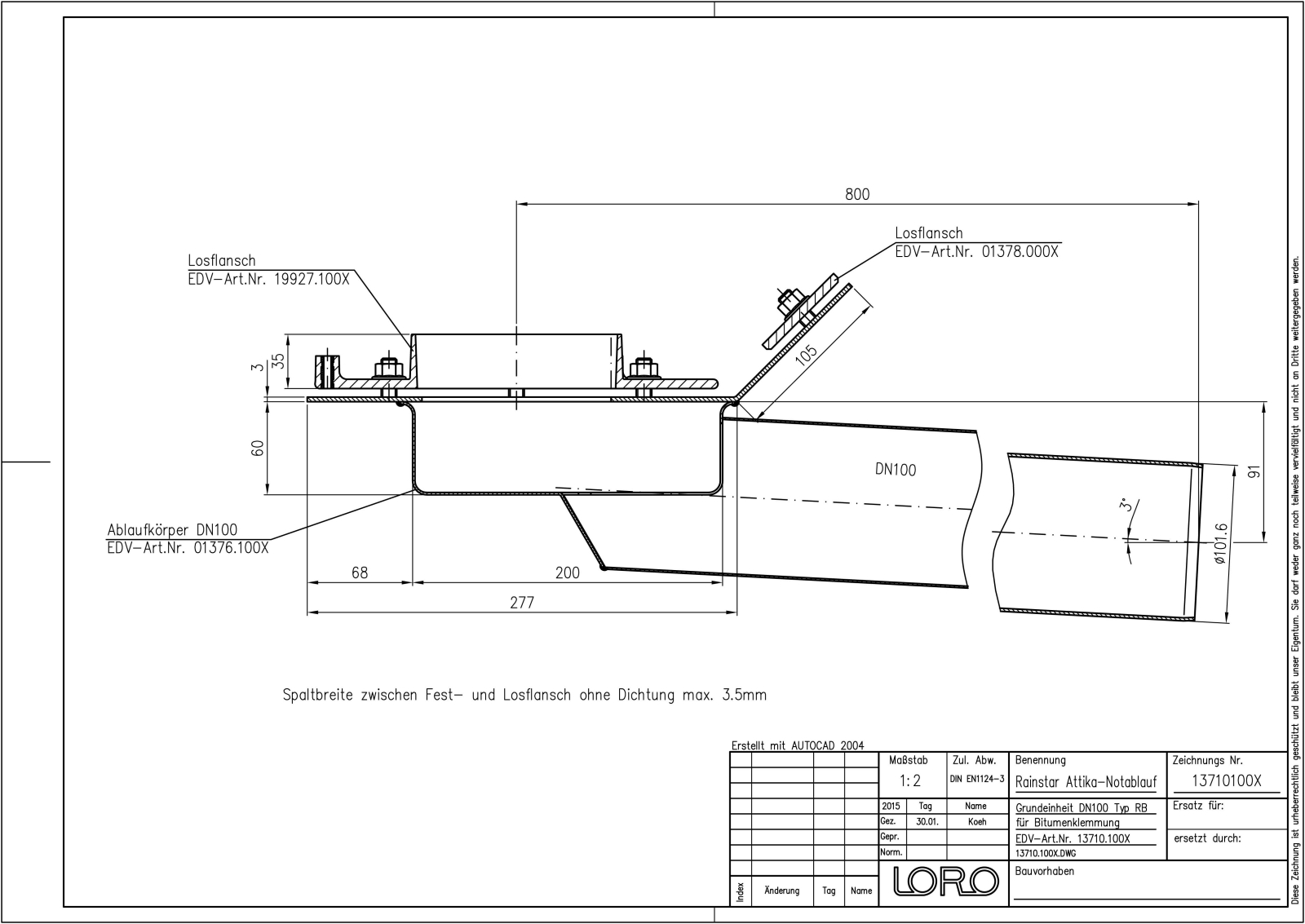 mit Klemmflansch als Los- und Festflanschkonstruktion für Bitumen-Abdichtungsbahnen aus Edelstahl DN 100