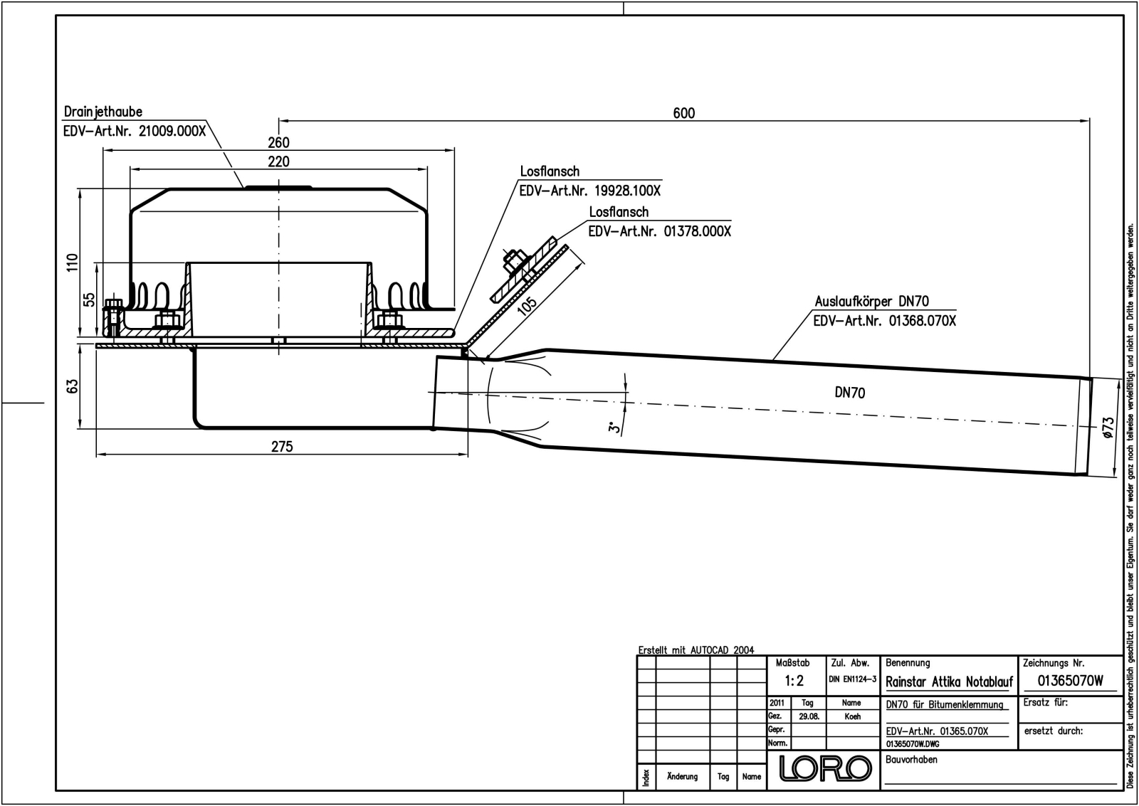 LORO-X RAINSTAR Attika-Schnellablauf, Serie 89 mit geringer Einbautiefe, für Notentwässerung mit Druckströmung, Abflussleistung 17,6 l/s bei 75 mm Wasserhöhe auf dem Dach, mit Klemmflansch, als Los- und Festflanschkonstruktion, 45 Grad Aufkantung für Bitumen-Abdichtungsbahnen, Eingrifftiefe 55 mm, mit DRAINJET-Haube aus Edelstahl, nach DIN EN 1253, Leistungsnachweis mit normgerechtem Prüfsystem mit 4,2m nicht belüfteter Fallleitung gemäß Systemdatenblatt LX798, aus Edelstahl, DN 70