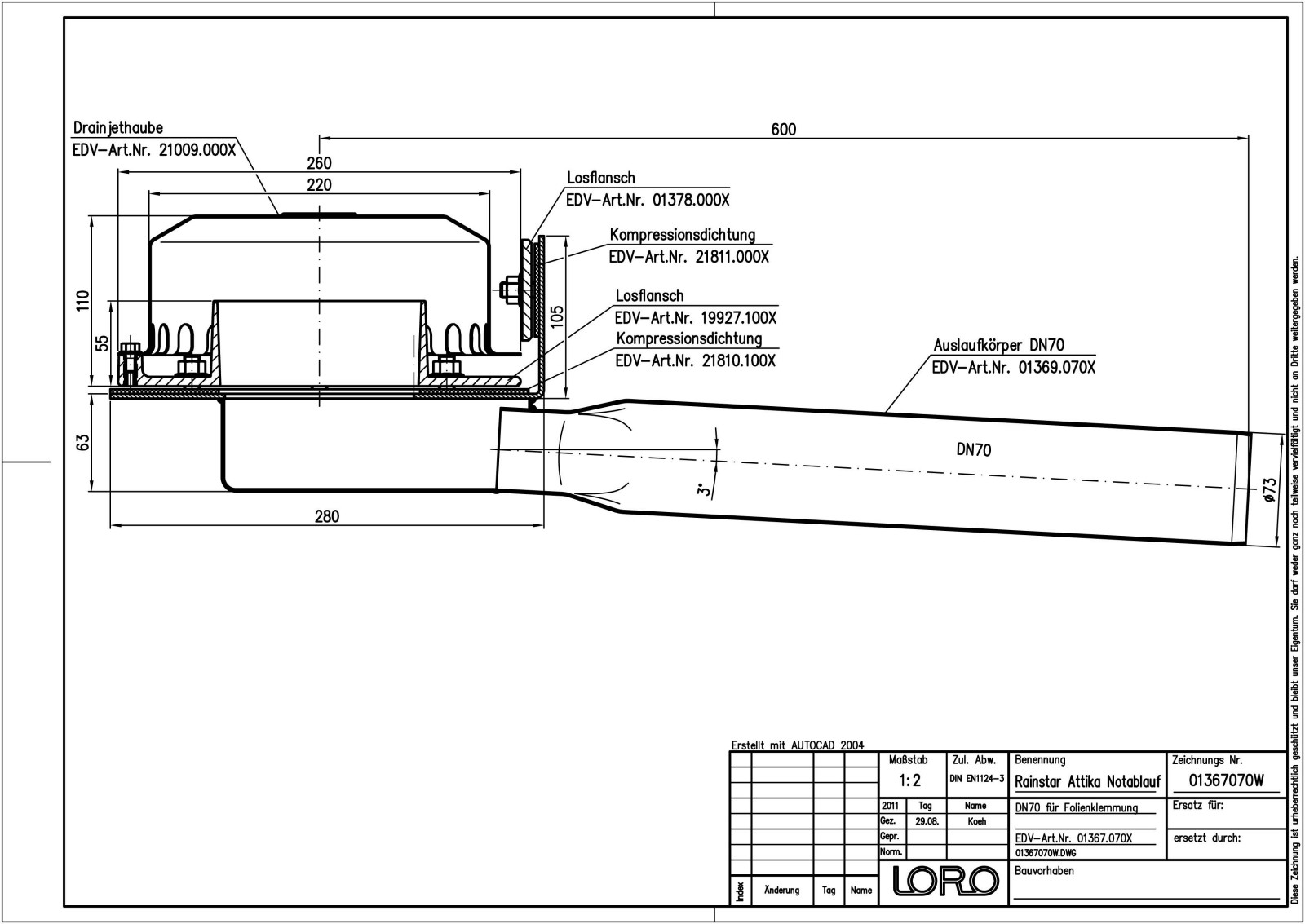LORO-X RAINSTAR Attika-Schnellablauf, Serie 89 mit geringer Einbautiefe, für Notentwässerung mit Druckströmung, Abflussleistung 17,6 l/s bei 75 mm Wasserhöhe auf dem Dach, mit Klemmflansch, als Los- und Festflanschkonstruktion, 90 Grad Aufkantung für Kunststoff-Abdichtungsbahnen, Eingrifftiefe 55 mm, mit DRAINJET-Haube aus Edelstahl, nach DIN EN 1253, Leistungsnachweis mit normgerechtem Prüfsystem mit 4,2m nicht belüfteter Fallleitung gemäß Systemdatenblatt LX798, aus Edelstahl, DN 70
