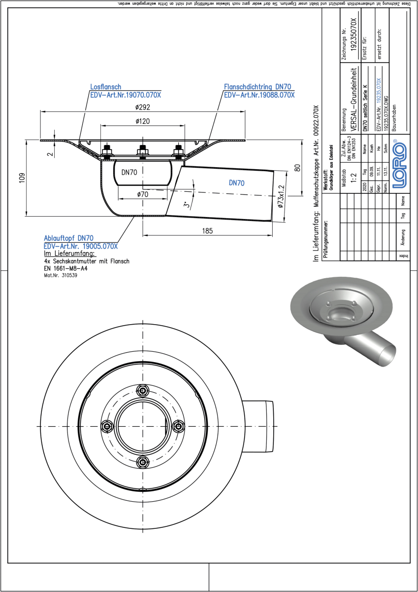 LORO-VERSAL Balkonablauf-Grundeinheit mit Klemmflansch, Serie K, nach DIN EN 1253 mit erhöhtem Qualitätsstandard gemäß RAL-Gütezeichen, aus Edelstahl, Auslauf 3 Grad, ohne Wärmedämmung, bestehend aus Ablauftopf, Flanschdichtring, Losflansch, DN 70