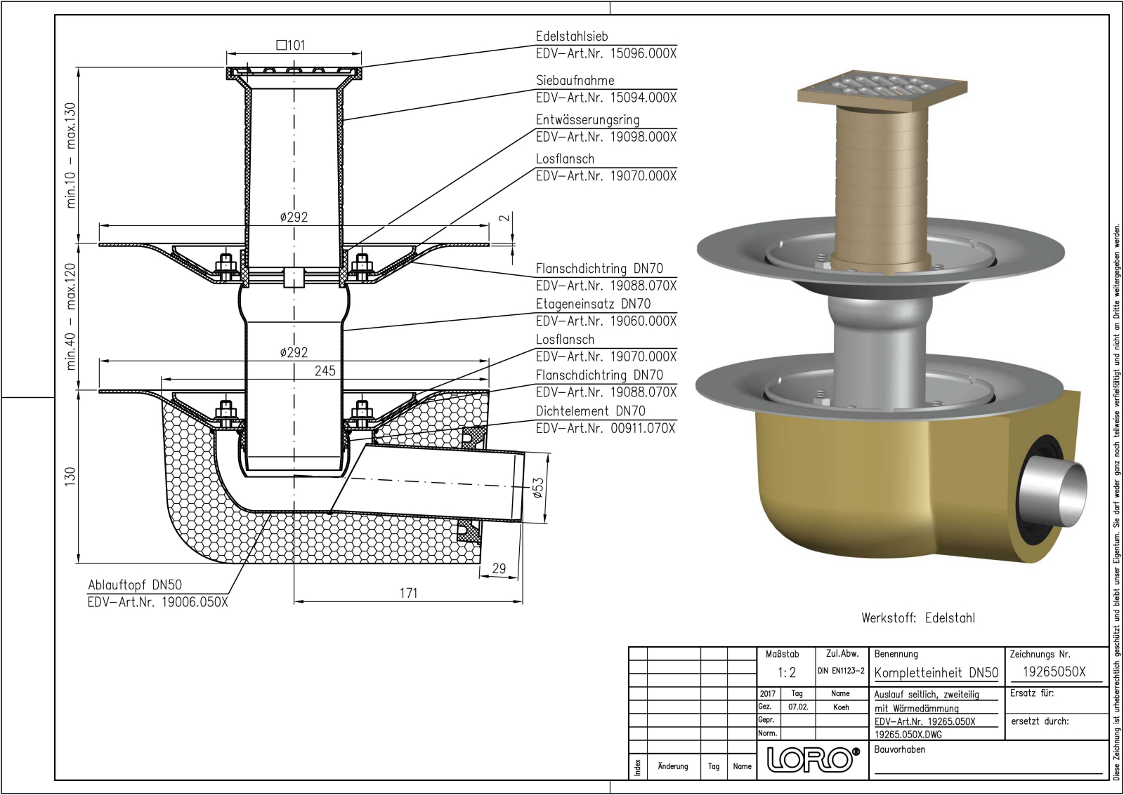 LORO-X VERSAL Balkonablauf, Serie K, zweiteilig mit Wärmedämmung, Auslauf seitlich 3 Grad, mit Klemmflansch, nach DIN EN 1253 mit erhöhtem Qualitätsstandard gemäß RAL-Gütezeichen GZ-694, aus Edelstahl, bestehend aus Ablauftopf, Flanschdichtring, Losflansch, Dichtelement, Etageneinsatz (für Aufbauhöhe 40 - 120 mm), Flanschdichtring, Losflansch, Entwässerungsring, Siebaufnahme 100 x 100 mm (für Aufbauhöhe 10 - 130 mm), Edelstahlsieb, DN 50