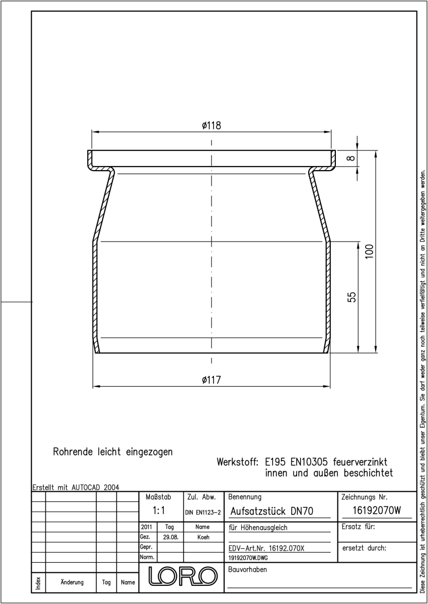 LORO-Aufsatzstück für LORO-Balkondirektablauf Serie G, aus Stahl, feuerverzinkt , langlebige Innenbeschichtung gemäß DIN EN ISO 2178 auf Basis einer 2K-Epoxid-Kombination, Farbton: Rotbraun, für Höhenausgleich 30 - 65 mm, DN 70