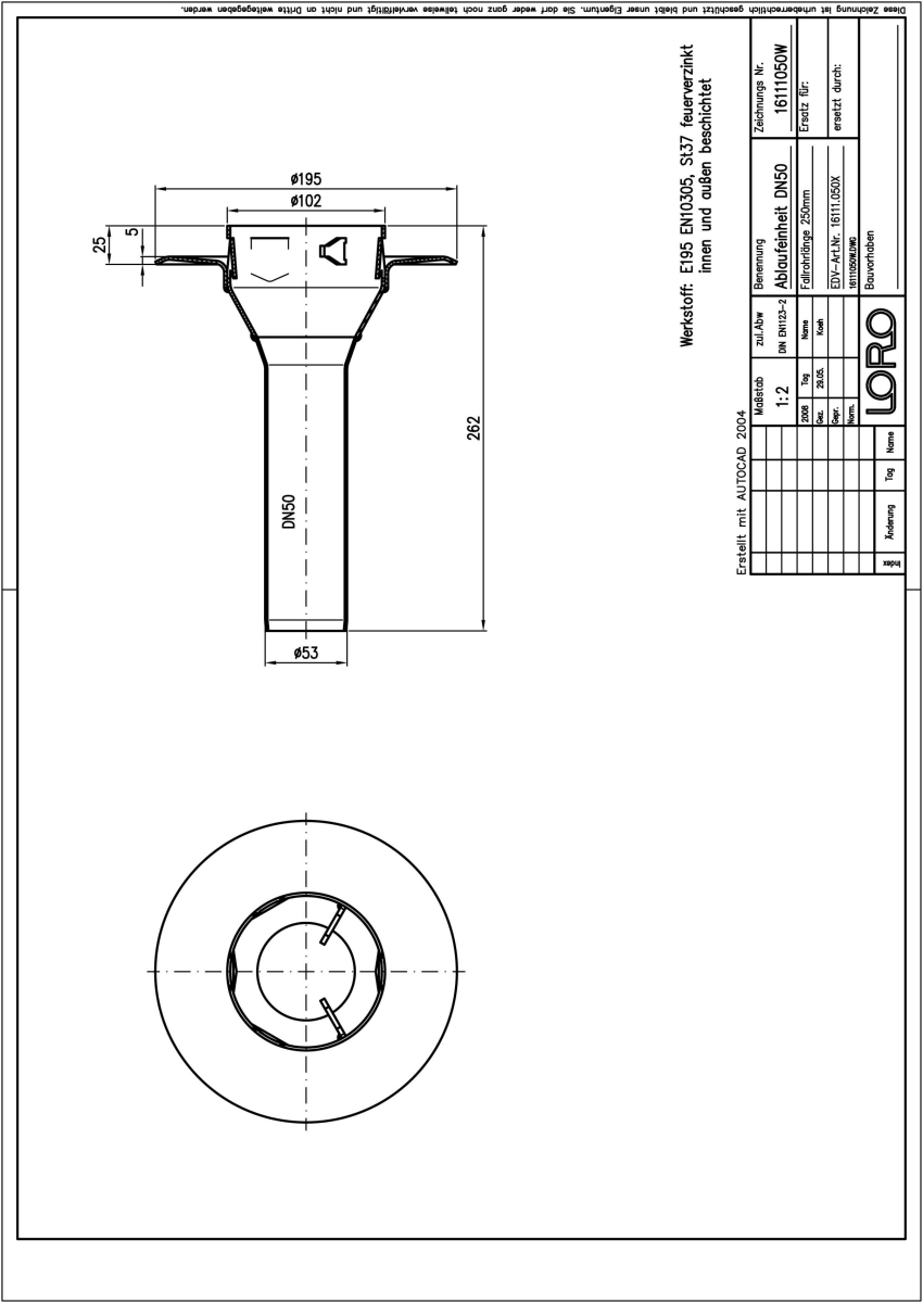 LORO-X Balkondirektablauf, Serie G mit Stützrand ohne Sieb, Auslauf senkrecht, nach DIN EN 1253 mit erhöhtem Qualitätsstandard gemäß RAL-Gütezeichen GZ-694, aus Stahl feuerverzinkt, mit langlebiger Beschichtung gemäß DIN EN ISO 2178 auf Basis einer 2K-Epoxid-Kombination, Farbton: Rotbraun, Fallrohrlänge 250 mm, DN 50