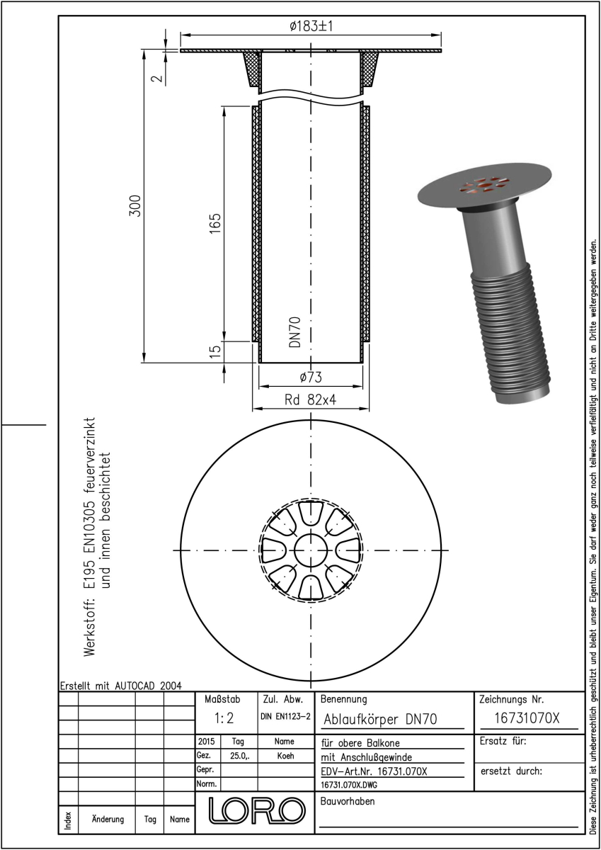 LORO-VERSAL Balkondirektablauftopf mit Stützrand und Anschlussgewinde, Serie J, für obersten Balkon, aus Stahl, feuerverzinkt , langlebige Innenbeschichtung gemäß DIN EN ISO 2178 auf Basis einer 2K-Epoxid-Kombination, Farbton: Rotbraun, für Deckenstärke 140 - 240 mm, DN 70