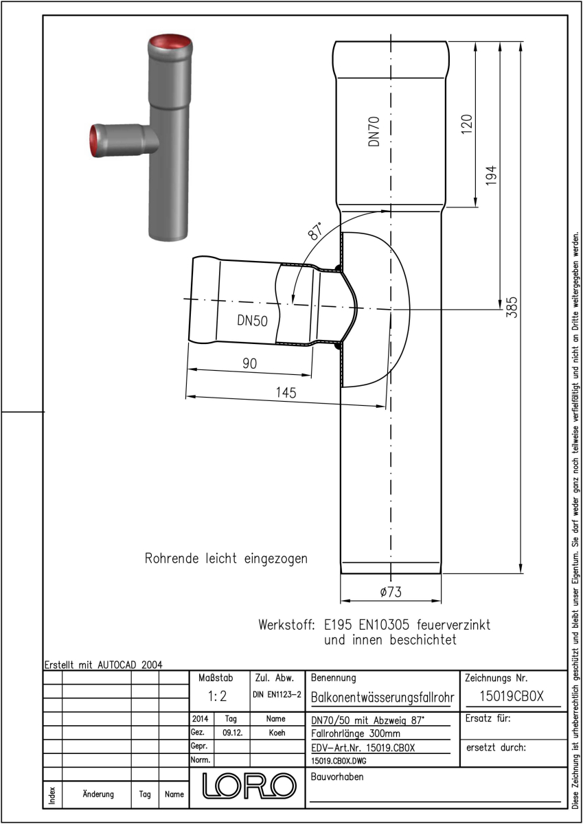 LORO-Balkonablaufentwässerungsfallrohr mit Abzweig 87 Grad, aus Stahl, feuerverzinkt, mit Langmuffe am Fallrohr und Abzweig, nach DIN EN 1253 mit erhöhtem Qualitätsstandard gemäß RAL-Gütezeichen GZ-694, langlebige Innenbeschichtung gemäß DIN EN ISO 2178 auf Basis einer 2K-Epoxid-Kombination, Farbton: Rotbraun, Fallrohrlänge 300 mm, DN 70/50