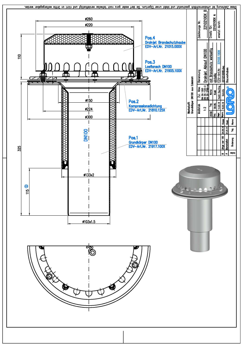 LORO-X DRAINJET Brandschutzablauf AbP.-Nr. P-MPA-E-09-010, Serie 49(DJ) einteilig Brandschutz werkseitig, Auslauf senkrecht, für Hauptentwässerung mit Druckströmung, mit Klemmflansch als Los- und Festflanschkonstruktion inklusive Kompressionsdichtungen, für Bitumen und Kunststoff Abdichtungsbahnen, DRAINJET-Haube aus Edelstahl, nach DIN EN 1253 mit erhöhtem Qualitätsstandard gemäß RAL-Gütezeichen GZ-694, aus Edelstahl, DN 100