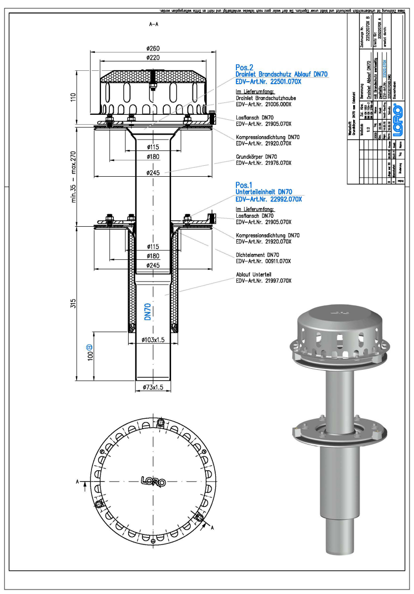 LORO-X DRAINLET Brandschutzablauf AbP.-Nr. P-MPA-E-09-010, Serie 84(DL) zweiteilig Brandschutz werkseitig, Auslauf senkrecht, für Hauptentwässerung mit Freispiegelströmung, mit Klemmflansch als Los- und Festflanschkonstruktion inklusive Kompressionsdichtungen, für Bitumen und Kunststoff Abdichtungsbahnen, DRAINLET-Haube aus Edelstahl, nach DIN EN 1253 mit erhöhtem Qualitätsstandard gemäß RAL-Gütezeichen GZ-694, aus Edelstahl, DN 70