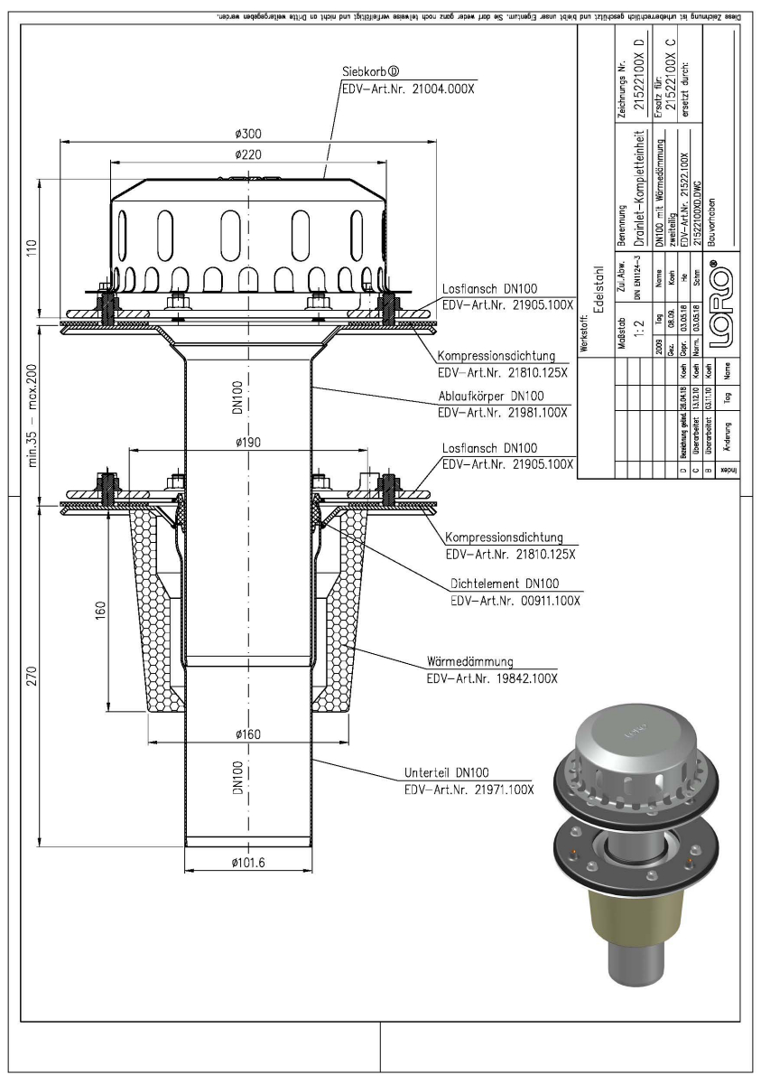 LORO-X DRAINLET Flachdachablauf, Serie 84(DL) zweiteilig mit Wärmedämmung, Auslauf senkrecht, für Hauptentwässerung mit Freispiegelströmung, Abflussleistung 6,5 l/s bei 35 mm Wasserhöhe auf dem Dach, mit Klemmflansch als Los- und Festflanschkonstruktion inklusive Kompressionsdichtungen, für Bitumen- und Kunststoff- Abdichtungsbahnen, DRAINLET-Haube aus Edelstahl, nach DIN EN 1253 mit erhöhtem Qualitätsstandard gemäß RAL-Gütezeichen GZ-694, Leistungsnachweis mit normgerechtem Prüfsystem mit 4,2m nicht belüfteter Fallleitung gemäß LX-Datenblatt LX873, aus Edelstahl, DN 100