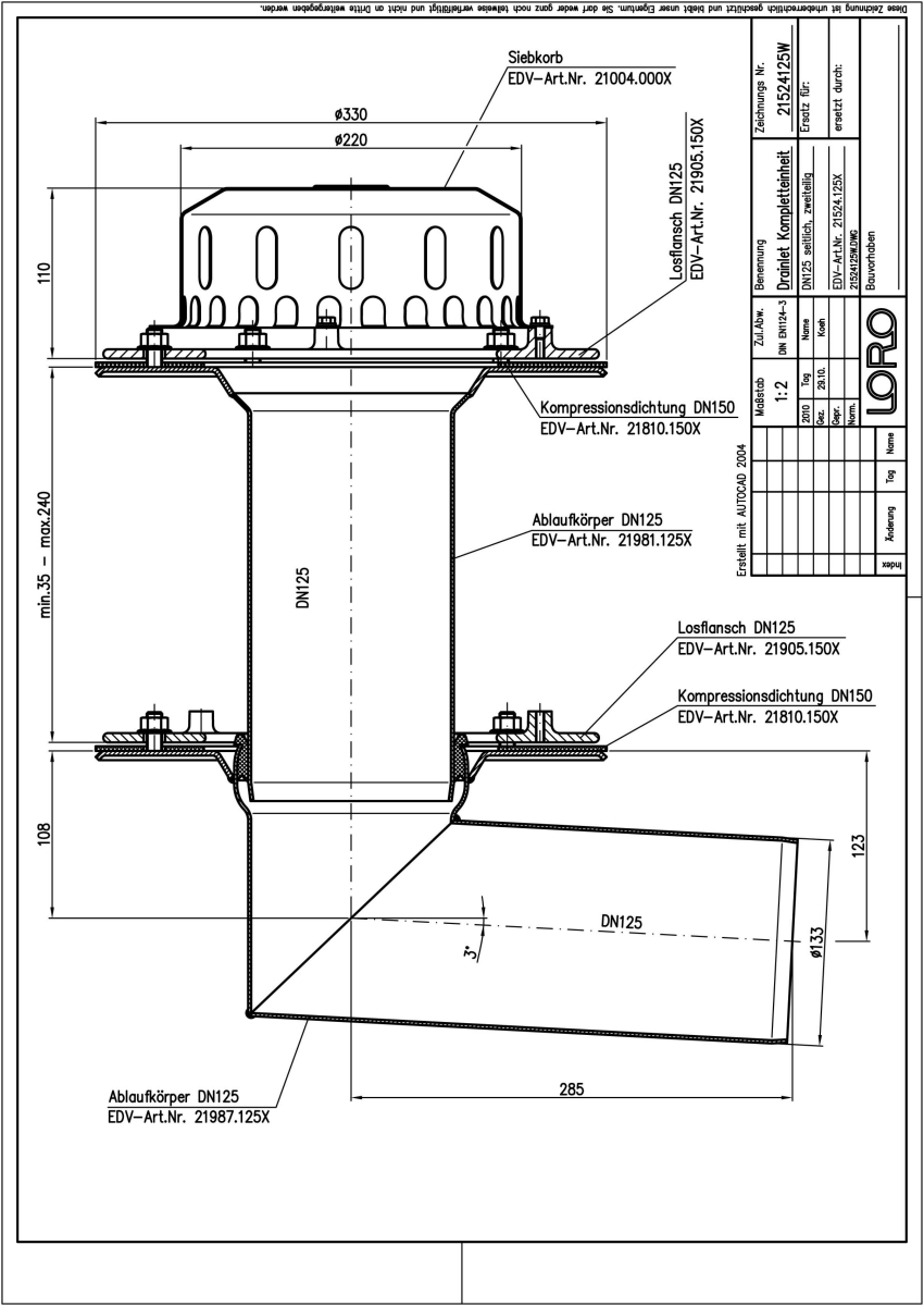 LORO-X DRAINLET Flachdachablauf, Serie 84(DL) zweiteilig ohne Wärmedämmung, Auslauf seitlich 3 Grad, für Hauptentwässerung mit Freispiegelströmung, Abflussleistung 9,2 l/s bei 45 mm Wasserhöhe auf dem Dach, mit Klemmflansch als Los- und Festflanschkonstruktion inklusive Kompressionsdichtungen, für Bitumen- und Kunststoff- Abdichtungsbahnen, DRAINLET-Haube aus Edelstahl, nach DIN EN 1253 mit erhöhtem Qualitätsstandard gemäß RAL-Gütezeichen GZ-694, Leistungsnachweis mit normgerechtem Prüfsystem mit 4,2m nicht belüfteter Fallleitung gemäß LX-Datenblatt LX890, aus Edelstahl, DN 125